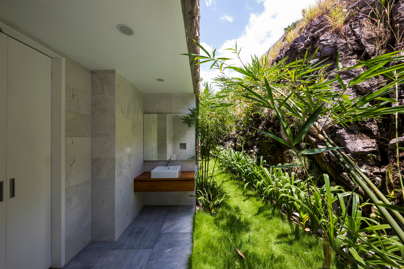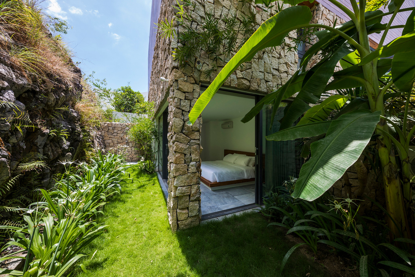 Một phòng ngủ khác riêng tư hơn với tầm nhìn ra góc hiên lót cỏ và tường đá.