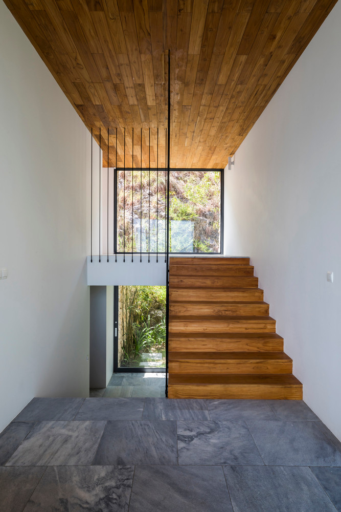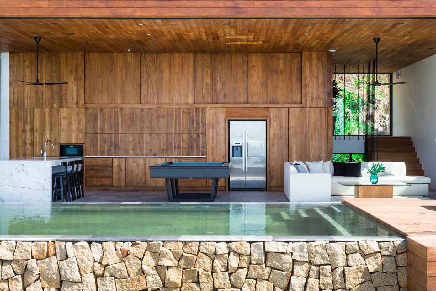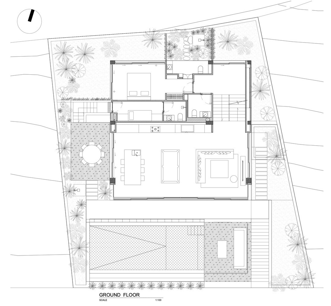Ngôi nhà nằm trên một “khối” lớn để có đủ chiều cao để có thể nhìn ra đường phố và các khu dân cư ở mặt tiền. Bể bơi là một thể tích ép đùn bổ sung, cao hơn mặt boong với 3 mặt tràn, tạo ra sự kết nối trực tiếp về mặt thị giác với cảnh biển.