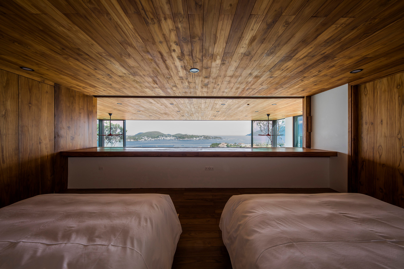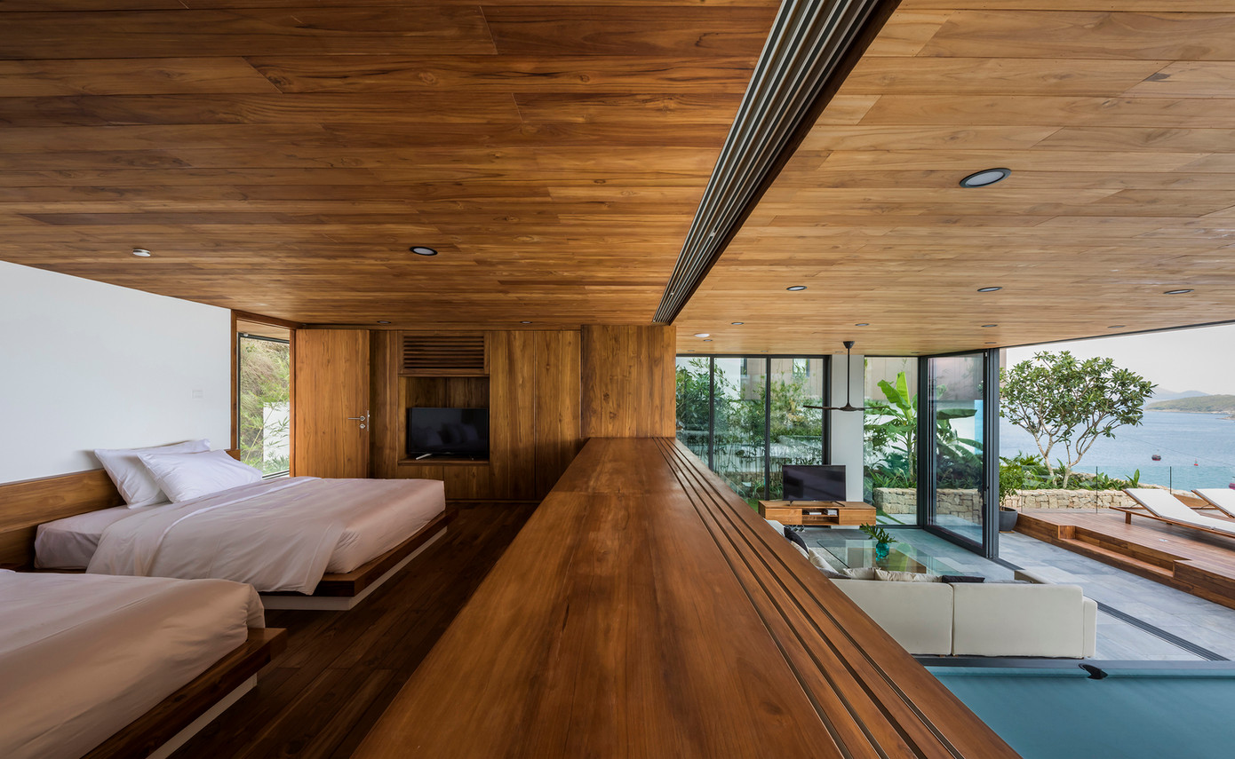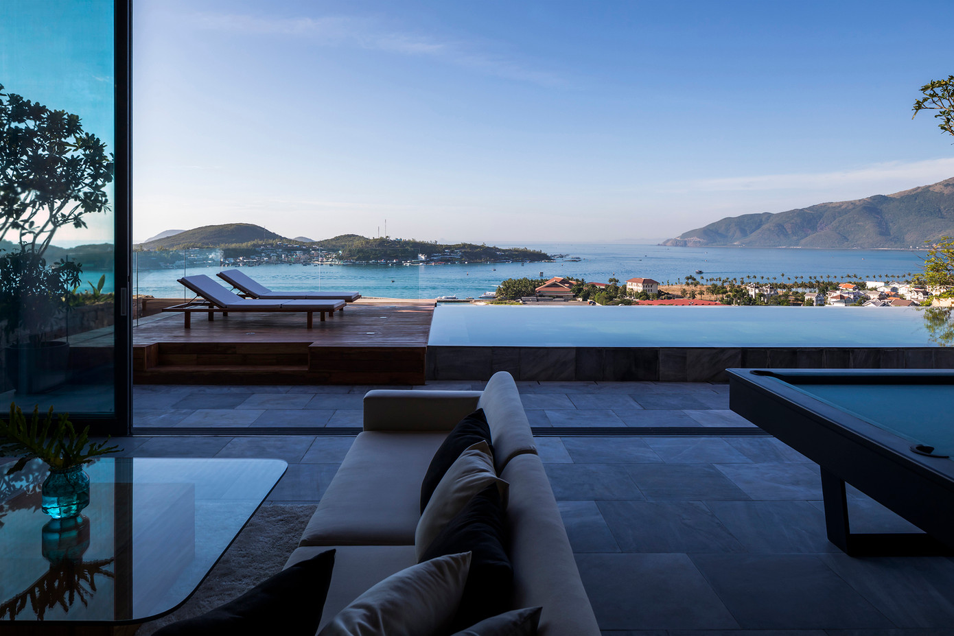 Với mục tiêu tối đa hóa khả năng lưu trữ và trải nghiệm giải trí, cấu trúc không gian bên trong được bố trí theo các cấp nhìn ra phía biển, cao nhất là khu vực ngủ, tiếp theo là khu vực khách và cuối cùng là hồ bơi và tắm nắng.