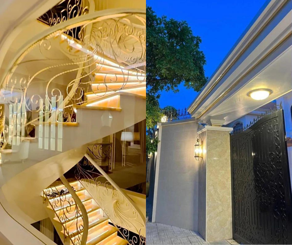 Toàn bộ phần cầu thang nhà Lệ Quyên đều được dát vàng. Hơn thế nữa, trên Instagram cá nhân, nữ ca sĩ 8X từng tiết lộ 3 tỷ đồng là số tiền chỉ vừa đủ để cô... xây cổng cho căn biệt thự "chanh sả" này của mình.