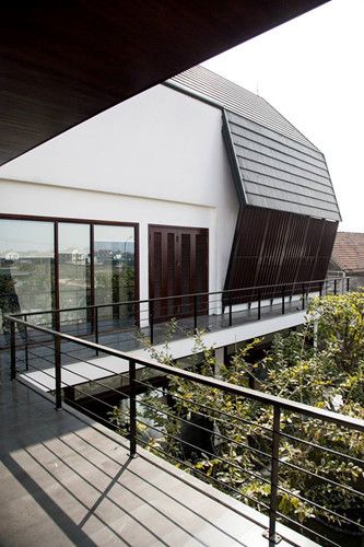 Hành lang thiết kế dọc tầng 2 tạo thuận tiện trong việc ngắm cảnh sân trong từ trên tầng.