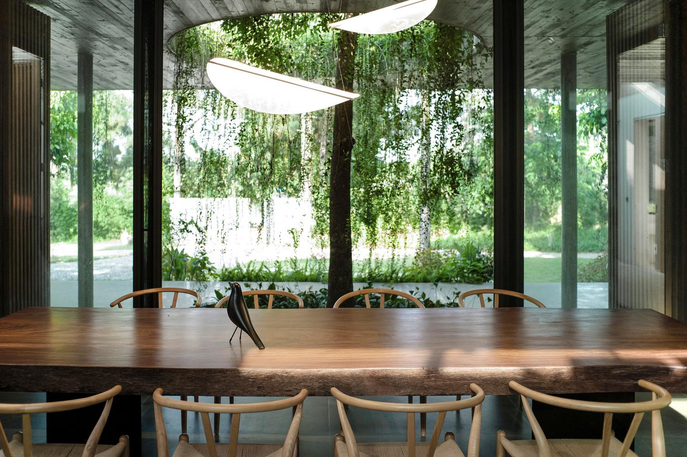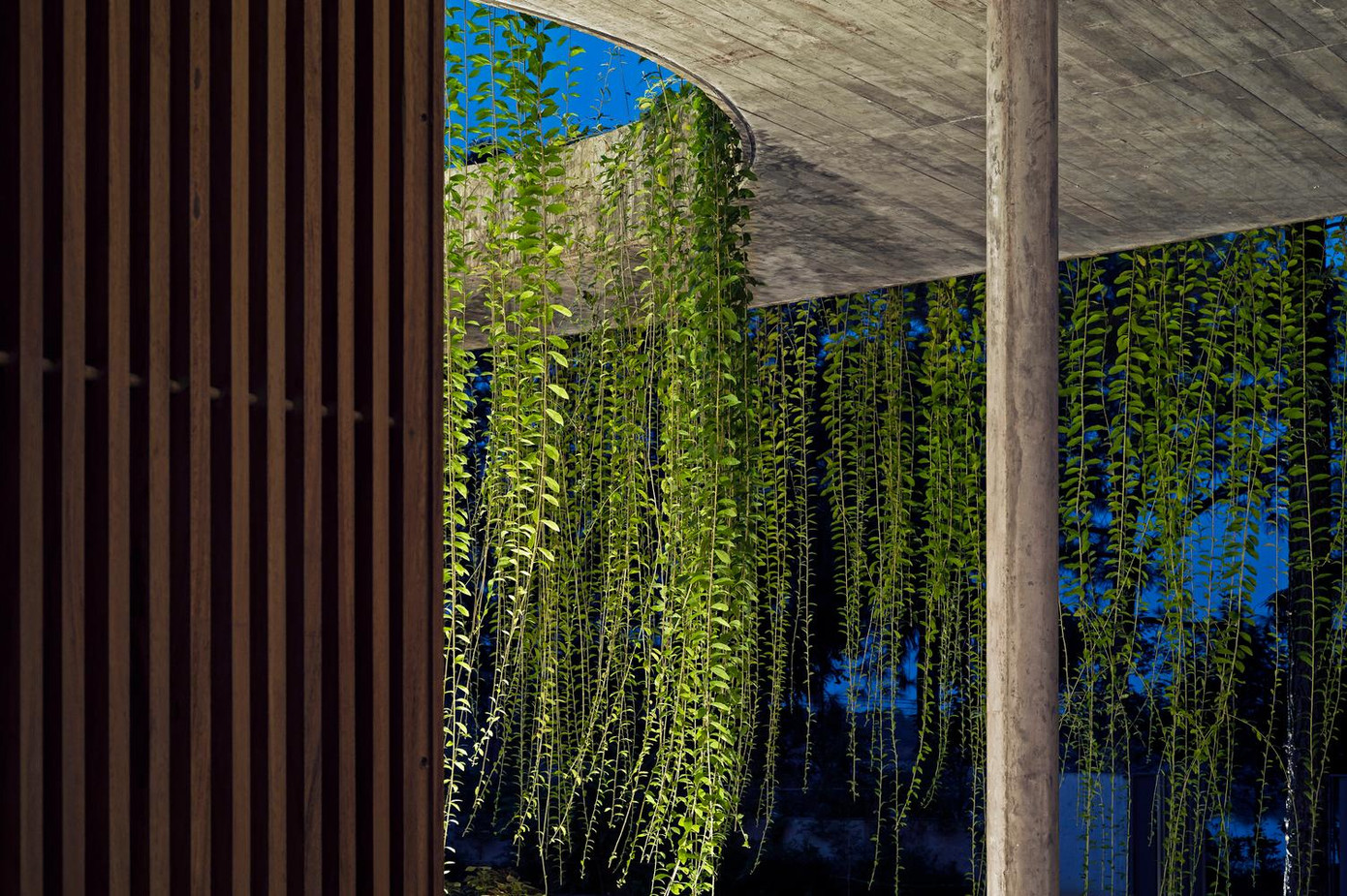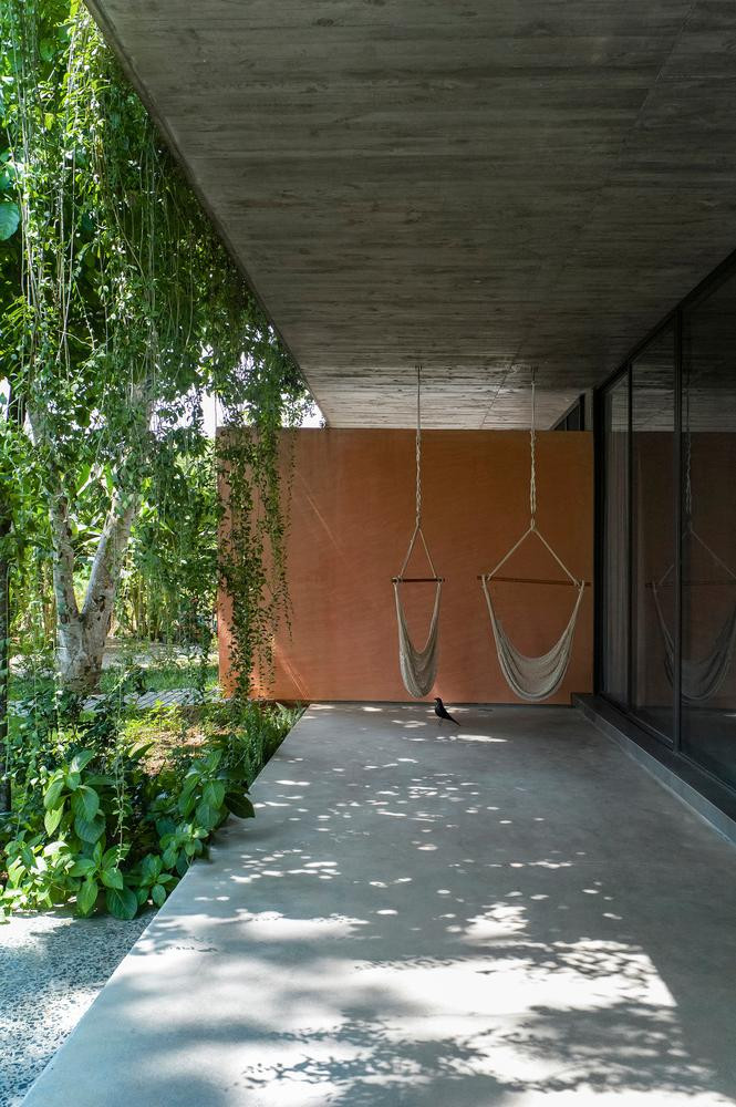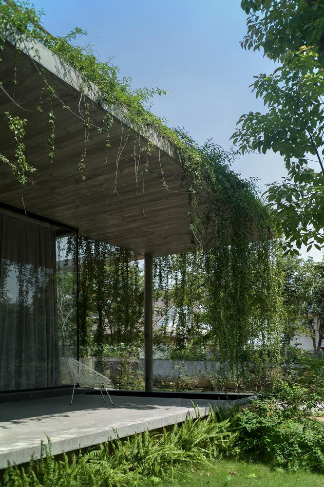 | Những tán cây mỏng nhẹ chạy dọc theo chiều dài của công trình tạo nên một hiên nhà rộng, thoáng, tràn ngập thiên nhiên xanh mát. |