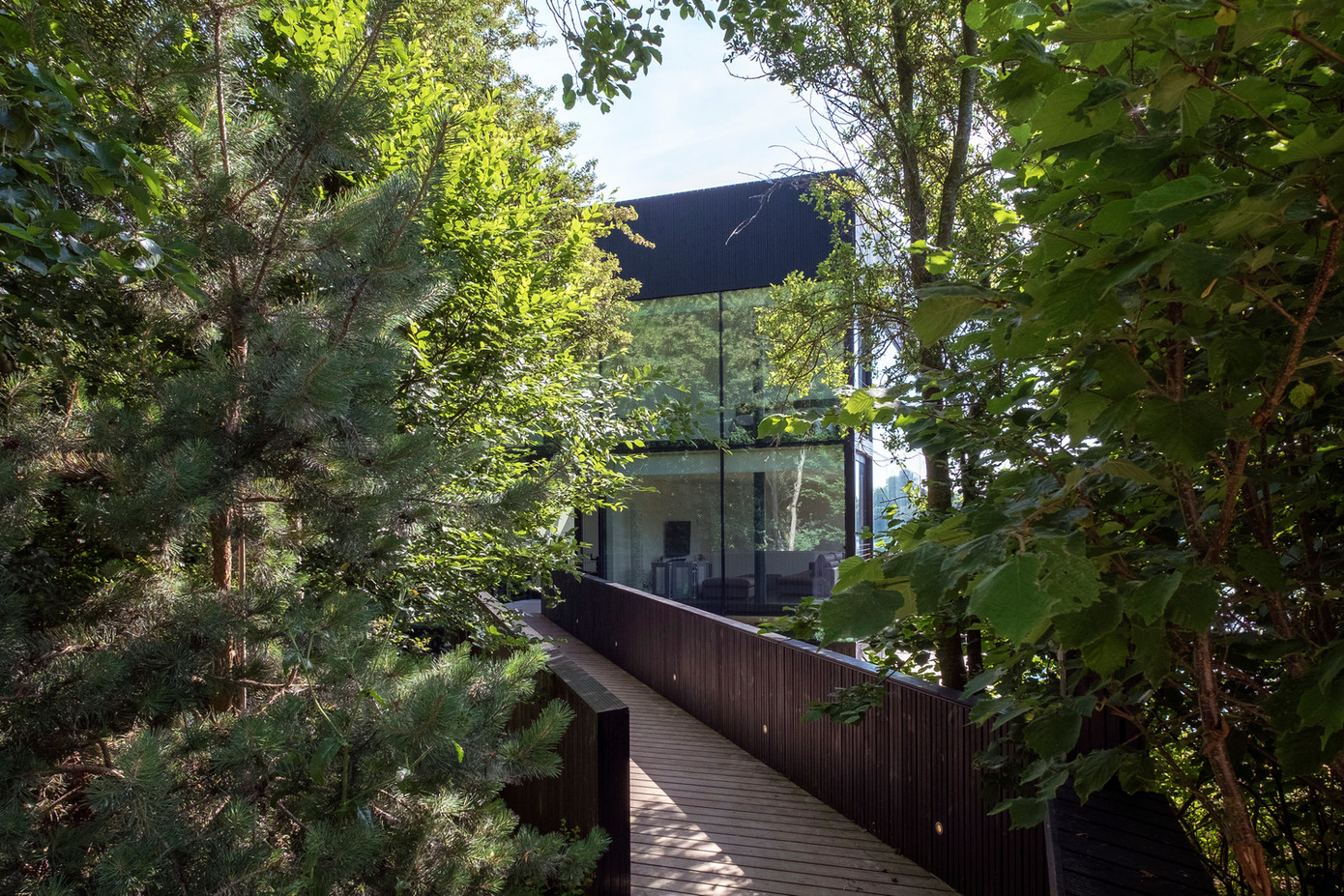 Giữa ngôi nhà và lô đất liền kề là một khoảng đất đồi có cây cao đảm bảo sự riêng tư. Được dẫn bằng cây cầu uốn cong nối biệt thự với đường chính, cũng nhờ đó mà hàng cây nguyên sinh còn được giữ nguyên vẹn, gắn liền xây dựng với sự bền vững.