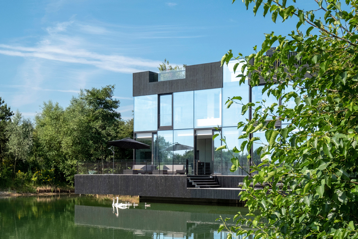 Với mục tiêu gắn kết ngôi nhà với thiên nhiên, cửa ở các phòng khách, nhà bếp, nhà tắm và các phòng ngủ được làm hoàn toàn bằng kính, bên trong có thể nhìn rõ cảnh quan bên ngoài, từ bên ngoài mặt kính phản chiếu được cả mặt hồ và mây trời.