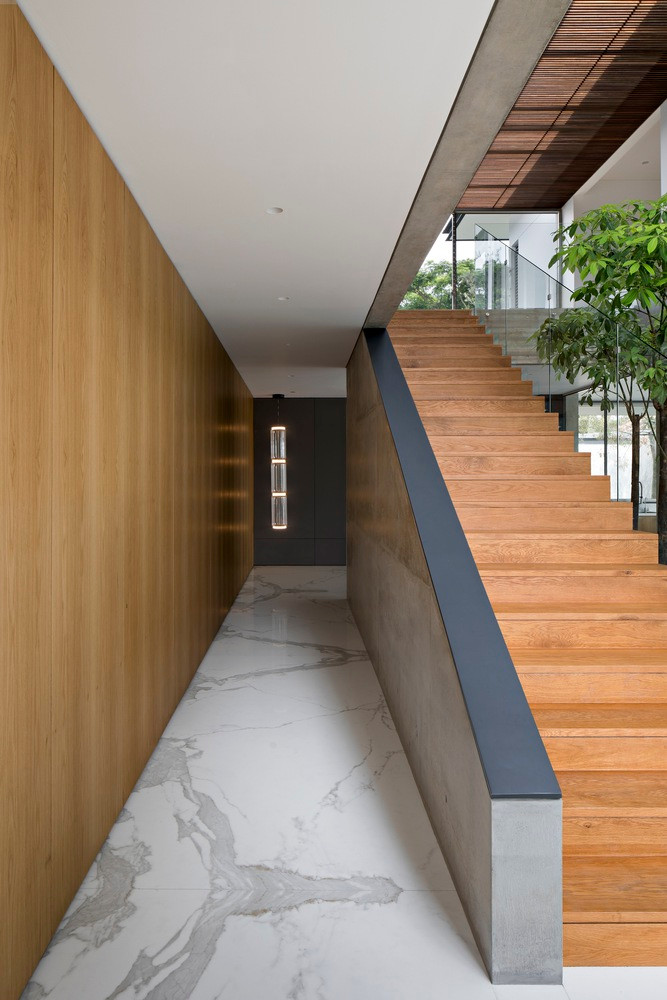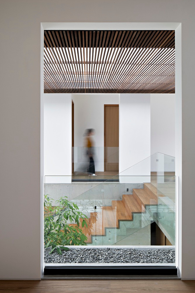 | Cầu thang dẫn lên tầng trên được bố trí khéo léo bằng cách hướng gia chủ và khách tham quan đến một không gian mở, nơi có cửa sổ kính lớn, ghi trọn khung cảnh tuyệt đẹp vào trong tầm mắt. |