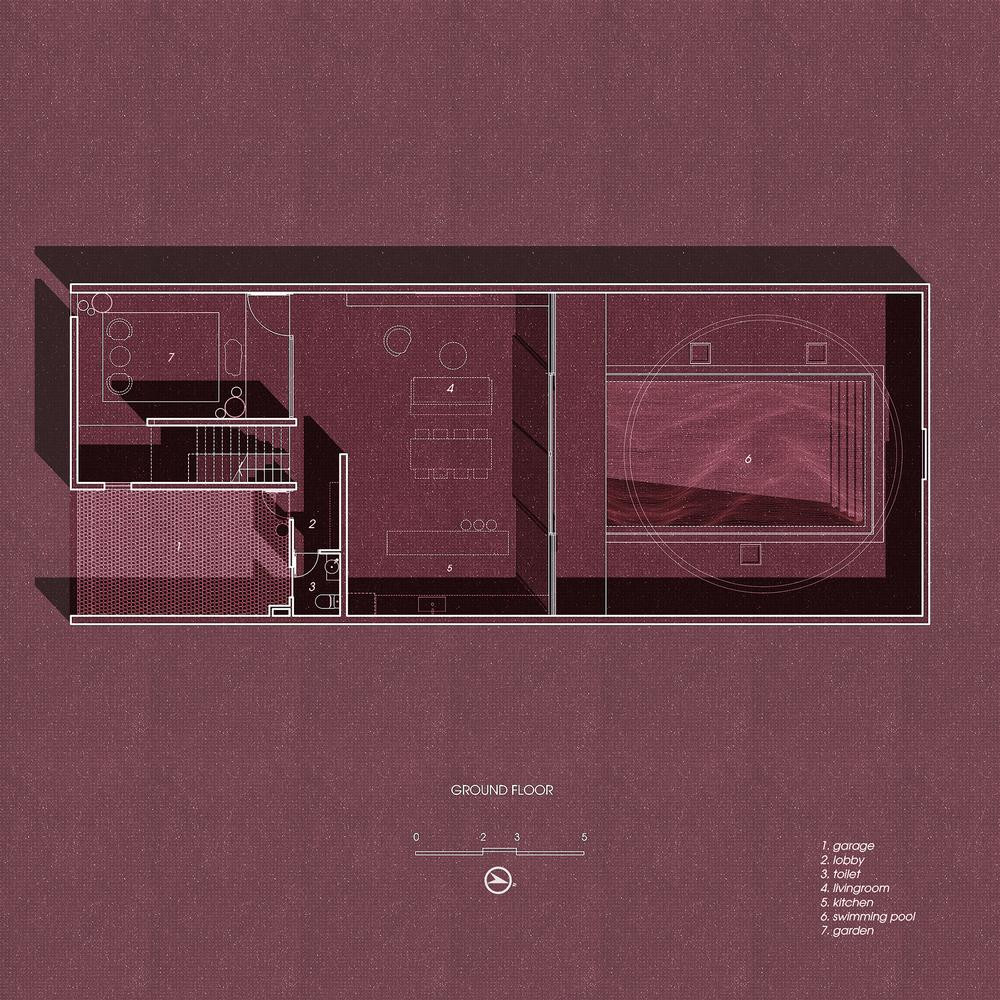 | Điểm nhấn của biệt thự là bể bơi nằm dưới khoảng mở hình tròn lớn. Tùy vào thời gian trong ngày mà ánh nắng chiếu qua khoảng mở sẽ liên tục thay đổi vị trí, lúc ở bể bơi, lúc ở trần tầng trệt, tạo sự thú vị cho giác quan. |