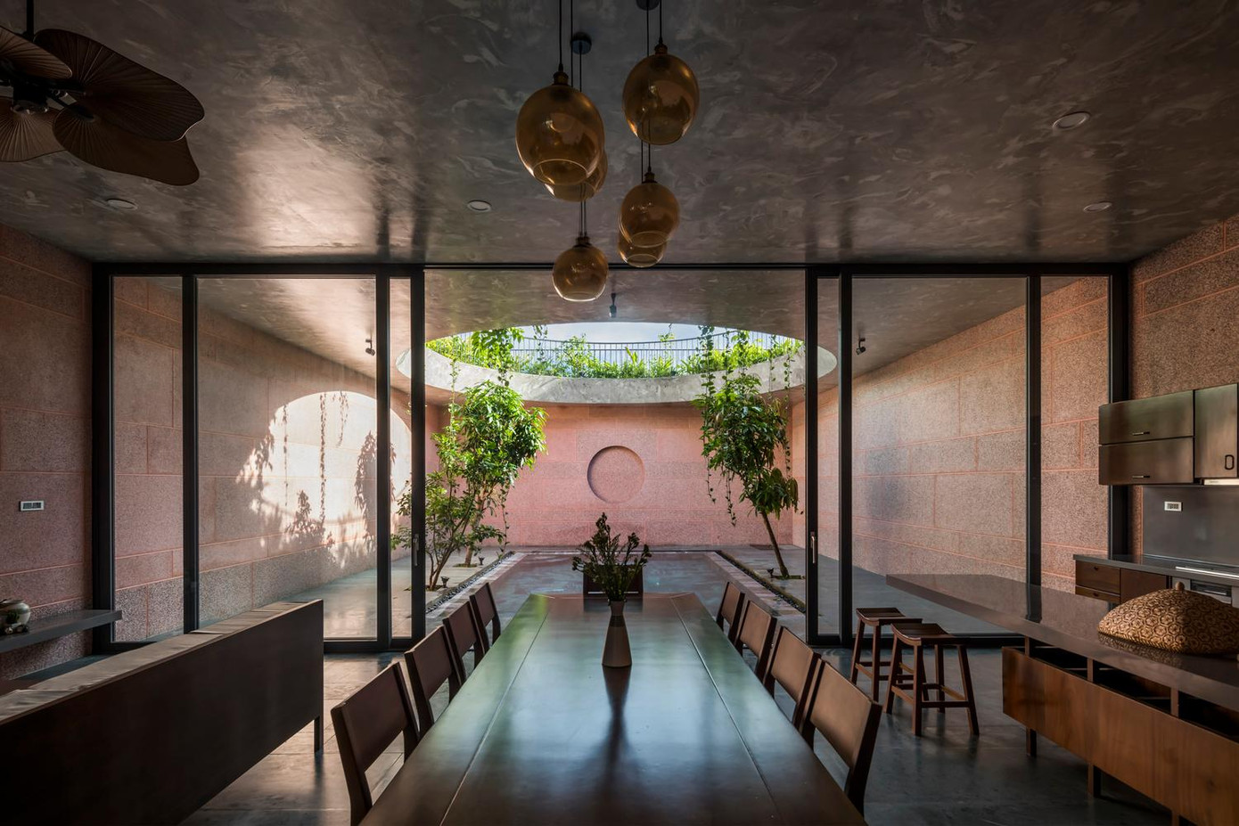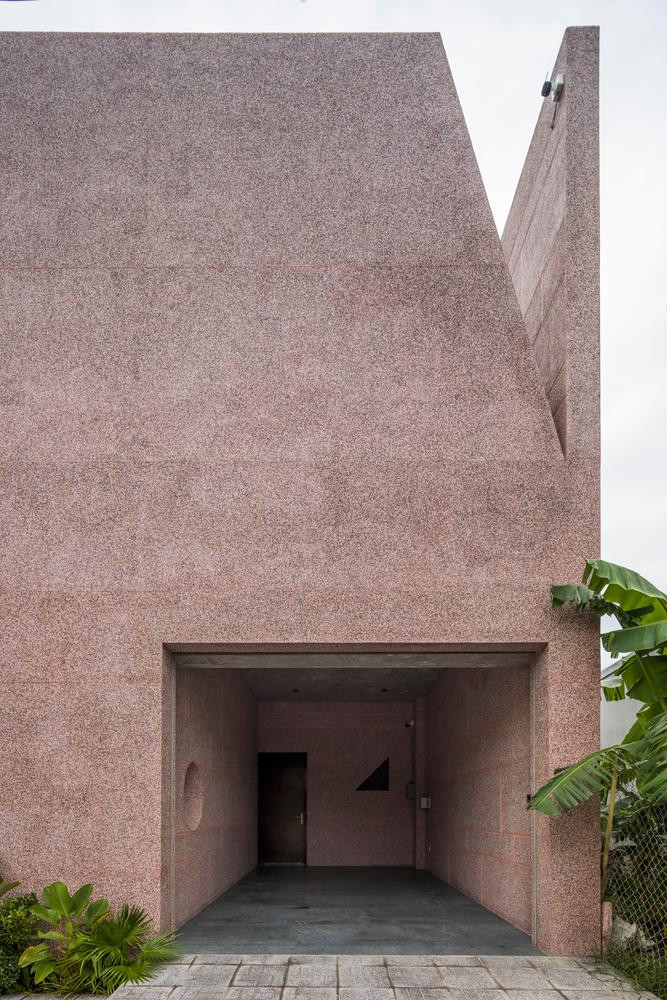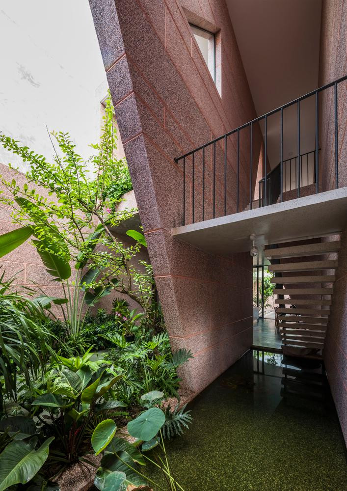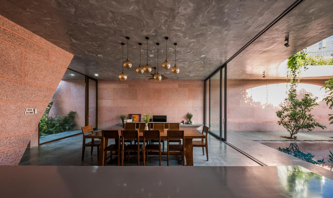 | Không gian được chia thành nhiều tầng khác nhau, cả ngôi nhà đều sử dụng vật liệu đá rửa màu hồng nhất quán. |