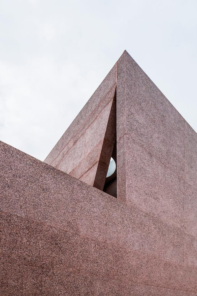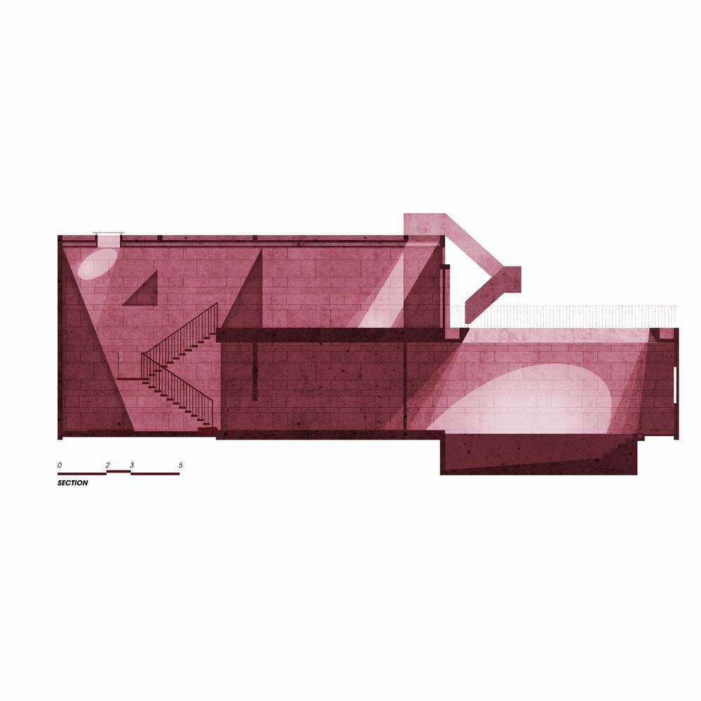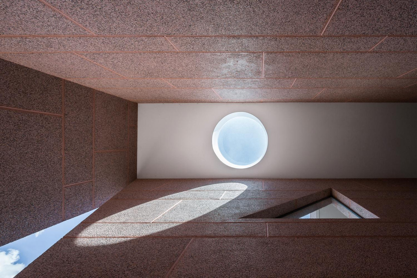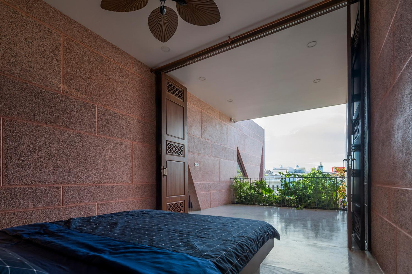 | Không gian được chia thành nhiều tầng khác nhau, cả ngôi nhà đều sử dụng vật liệu đá rửa màu hồng nhất quán. |