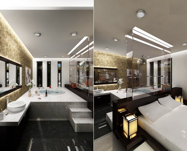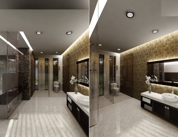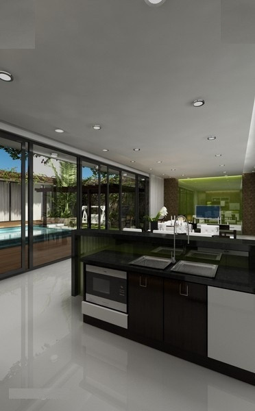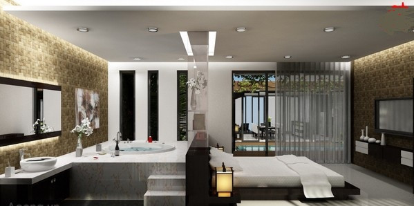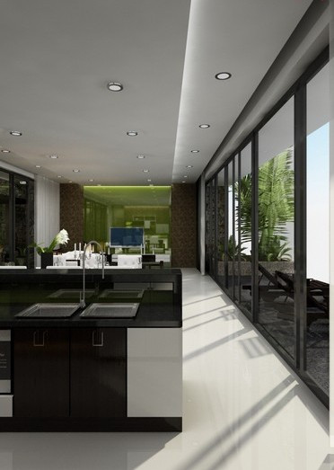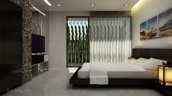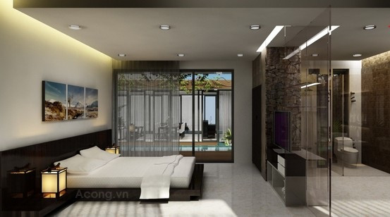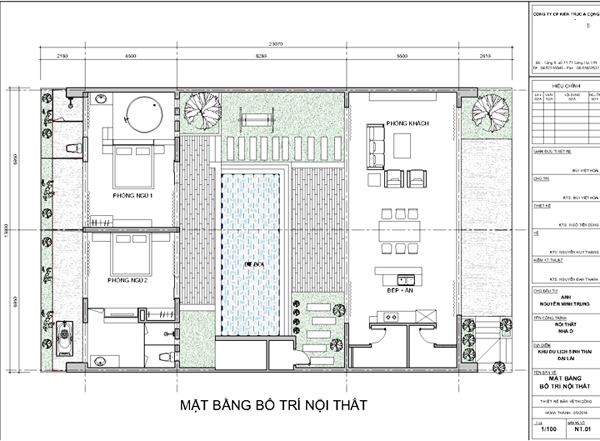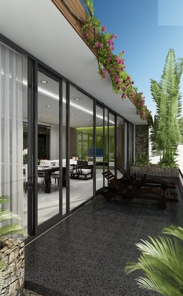 Thiết kế khoảng sân giữa, bao gồm bể bơi ở vị trí trung tâm, được bao quanh bởi sân vườn và hàng hiên