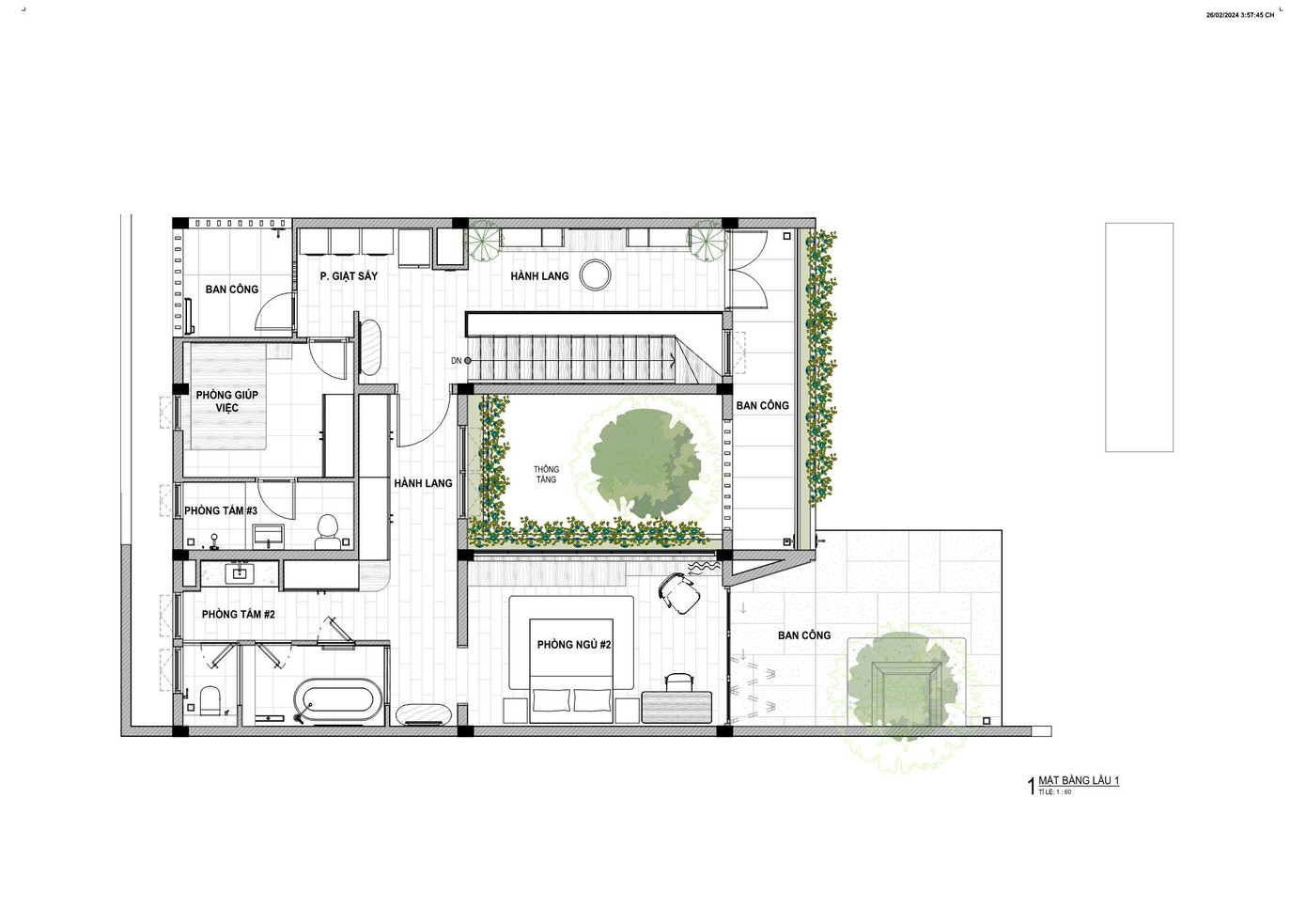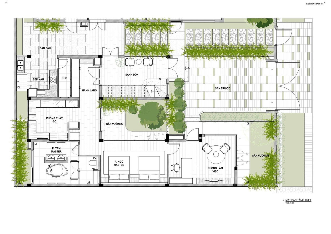 Theo đó, kiến trúc sư Sĩ Nhân đã đưa ra giải pháp thiết kế gồm 3 không gian chính với khối sân vườn giữa nhà làm trung tâm, kế đến là các phòng chức năng như phòng ngủ, phòng thay đồ, phòng làm việc… và thêm một lớp sân vườn bên ngoài.