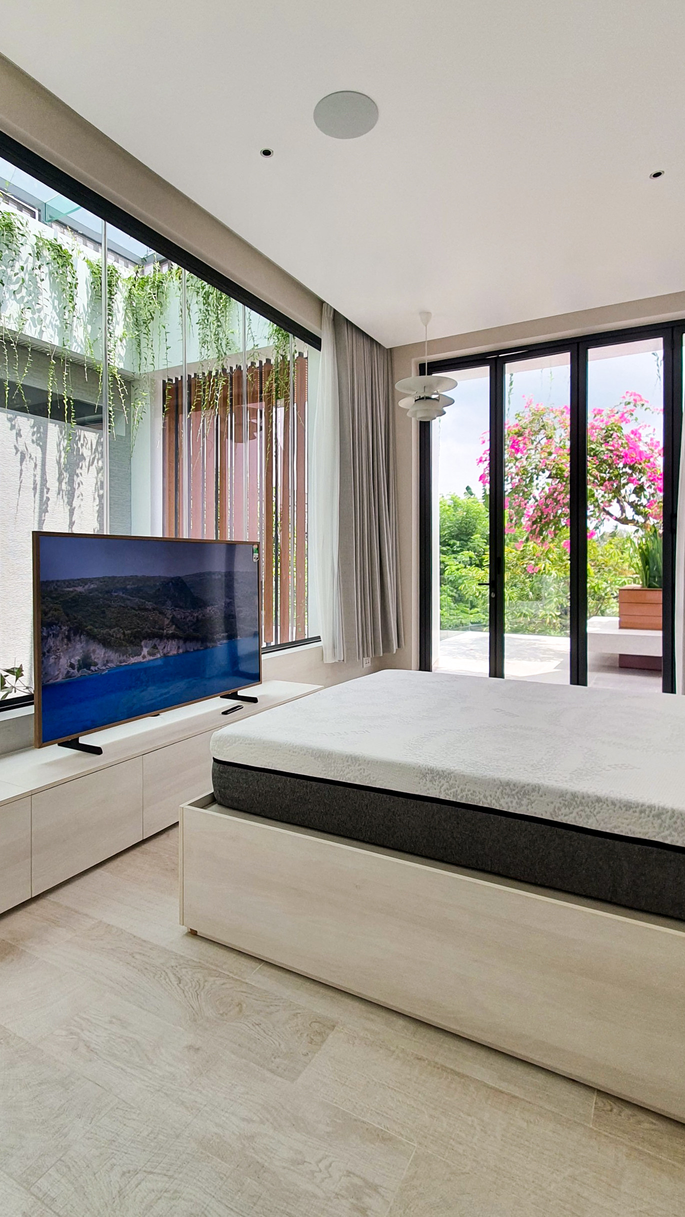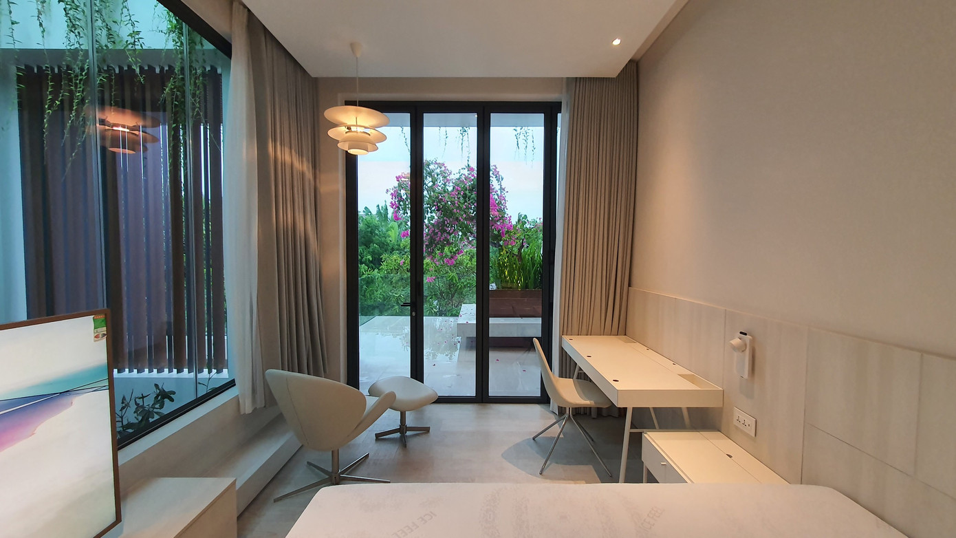 Phòng ngủ master và phòng làm việc master là không gian mà gia chủ và kiến trúc sư tâm đắc nhất, khi sân vườn và nội thất bên trong có thể hòa vào nhau mang lại cảm giác nghỉ ngơi giữa vườn cây, làm việc giữa vườn hoa, nhưng vẫn có thể tách biệt ra khi cần thiết.