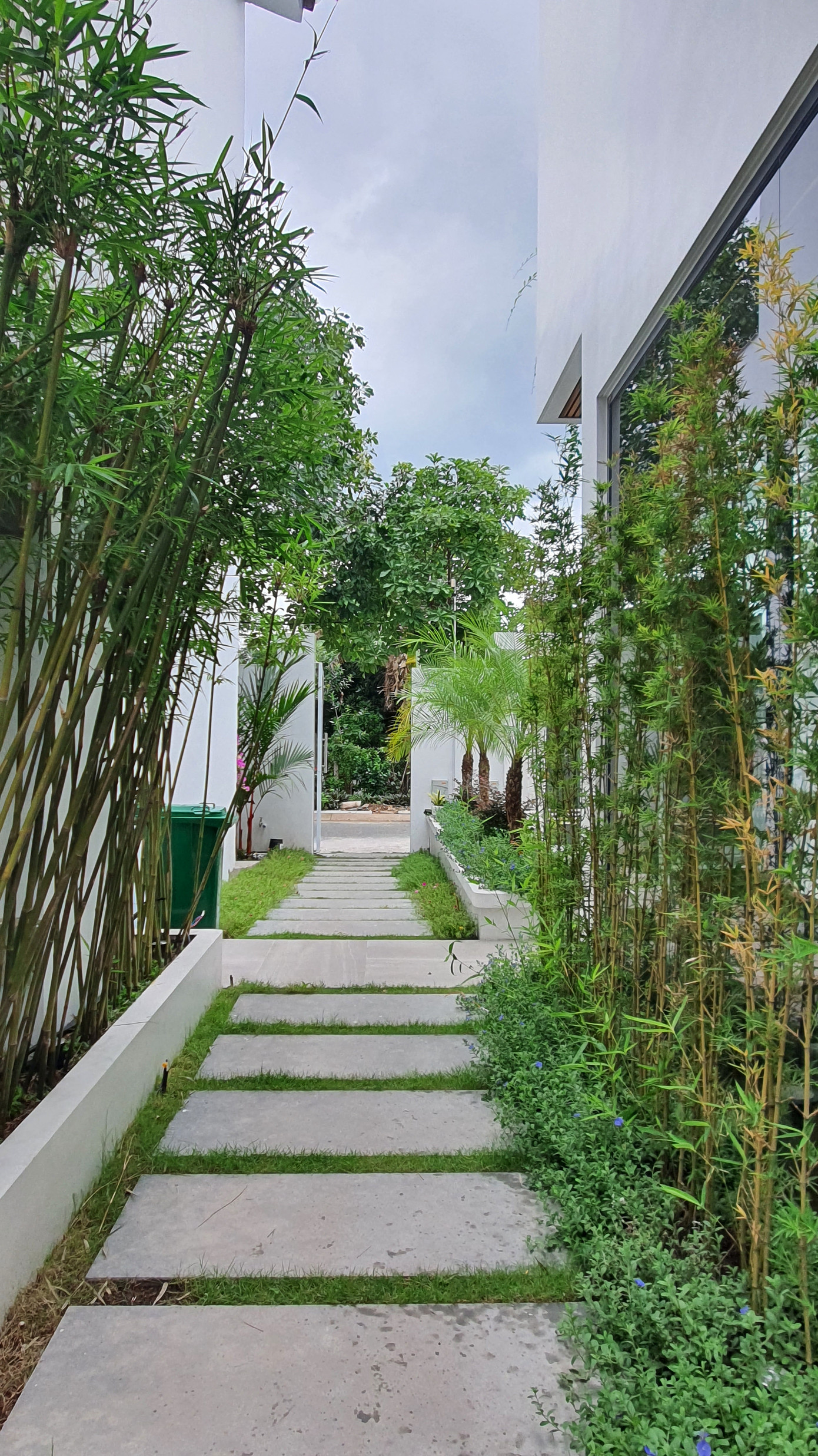 Khu vườn dọc lối đi tạo cảm giác thông thoáng cho sảnh đón ở tầng trệt.