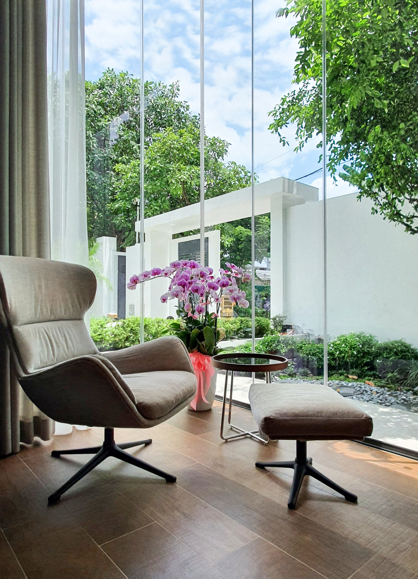 Với thiết kế nhiều sân vườn cùng hệ lam và các cửa kính xếp trượt không khung, gia chủ có thể chủ động mở cửa đón gió tự nhiên, mang lại sự thoáng đãng, mát mẻ.