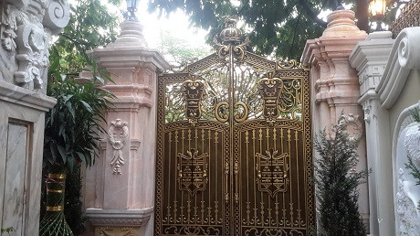 Chiếc cổng được mạ vàng và đồng kết hợp với cột đá được điêu khắc tinh tế