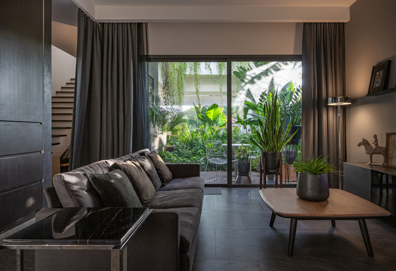 | Không gian sinh hoạt, ăn uống và bếp ở tầng một có tầm nhìn ra khu vườn xanh mát. |