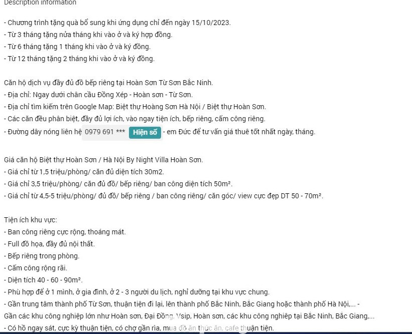 Tìm hiểu thực tế, hai tòa nhà này của cùng một chủ đầu tư, tổng quy mô gần 200 căn hộ, trong đó riêng tòa Villa Hoàn Sơn mới hoàn thiện, có quy mô tới 120 phòng, diện tích từ 30 – 70m2/căn hộ với giá thuê từ 3,5 – 7 triệu đồng/tháng chưa bao gồm các chi phí dịch vụ và tiện ích khác.