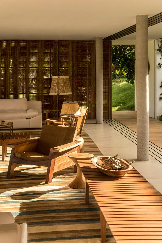 | Những cánh cửa mashrabiya - một yếu tố có lưới bằng gỗ, truyền thống trong kiến trúc thuộc địa và hiện đại của Brazil - có tác dụng che chắn cho nội thất của các phòng ngủ, cho phép gió thoảng qua; và chúng có thể vẫn mở hoàn toàn để kiểm soát hoàn toàn ánh sáng bên trong. |