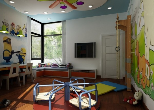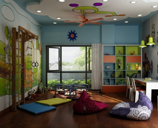 Thiết kế nội thất chú trọng vào việc tạo diện tích mặt sàn trống cho việc chơi đùa của trẻ, các hình khối & màu sắc mang tính giáo dục và các trò chơi kích thích việc vận động thể chất cho trẻ.