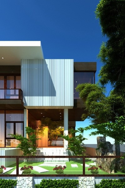 Sân vườn xung quanh nhà được tôn lên cao gần hết tầng 1 (để xe) vừa tạo sự riêng tư, vừa tạo sự gần gũi với cảnh quan bên ngoài của không gian sinh hoạt chung tại tầng 2.