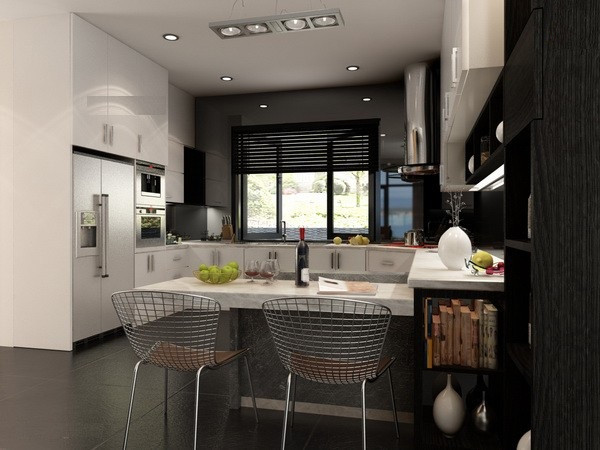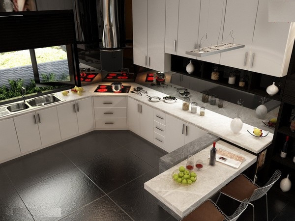 Màu đen của nền nhà tương phản mạnh với màu trắng của tủ bếp khiến cho tủ bếp càng thêm ấn tượng