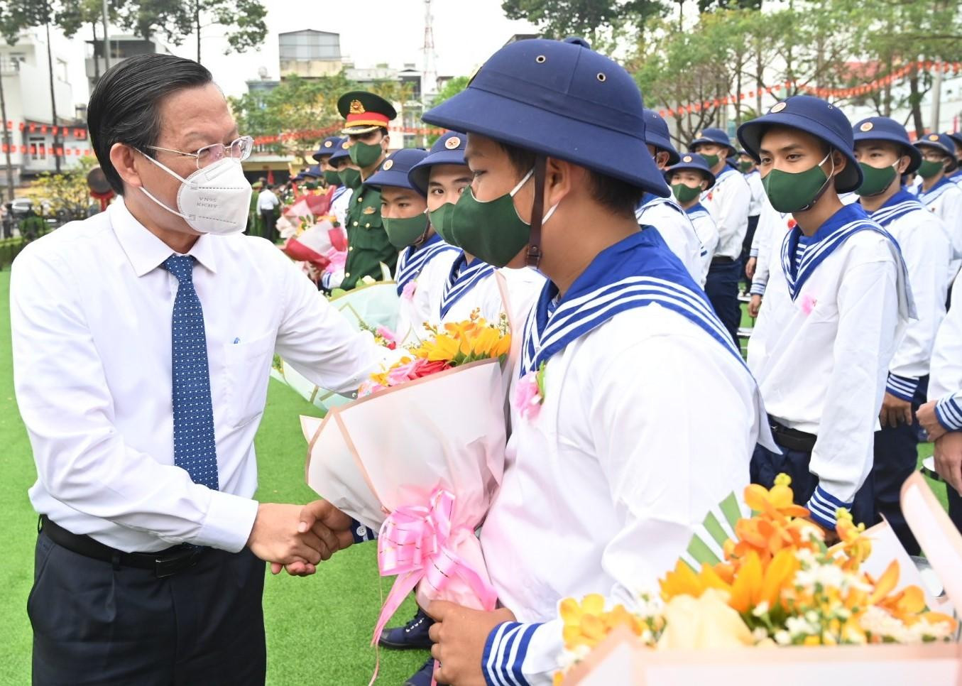 | Bí thư Thành ủy Nguyễn Văn Nên động viên chiến sĩ mới trước giờ lên đường nhập ngũ. |