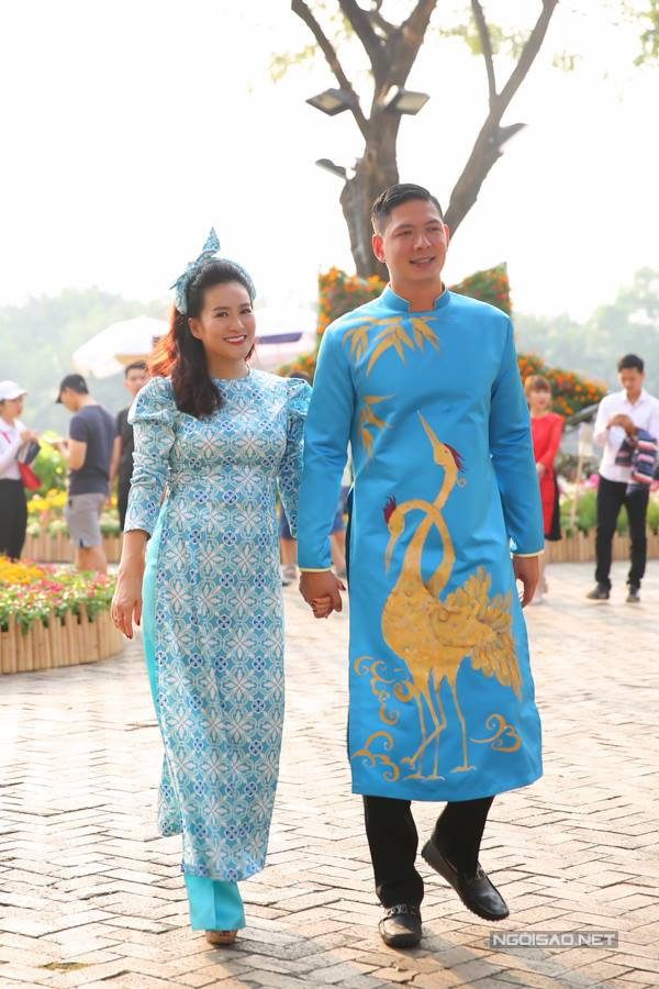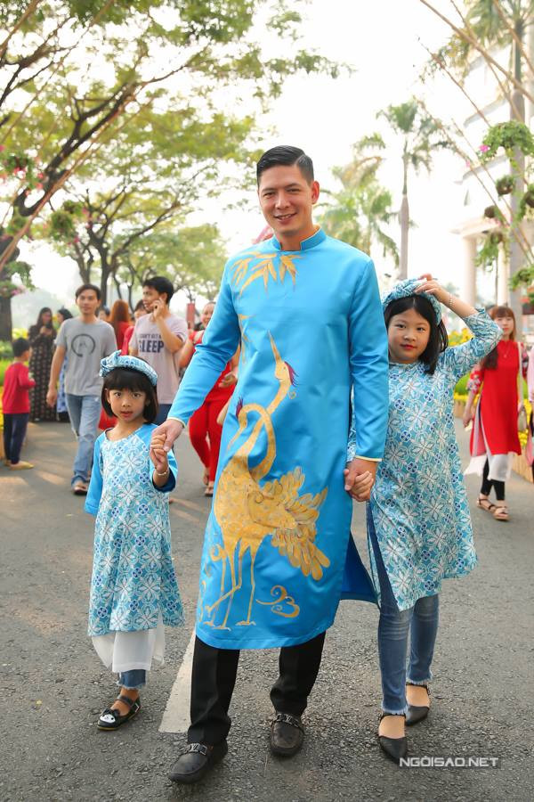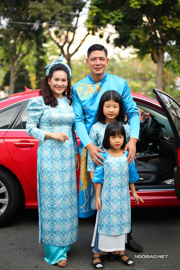 Cả gia đình nam diễn viên mặc áo dài ton-sur-ton màu xanh da trời.