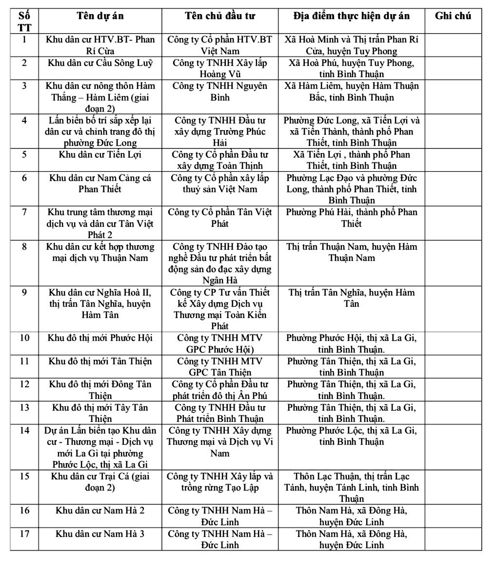 | Chi tiết danh sách 33 dự án bất động sản bị Sở Xây dựng tỉnh Bình Thuận chấn chỉnh. |