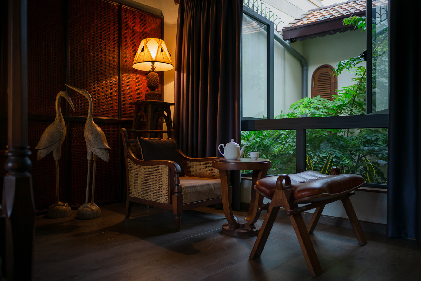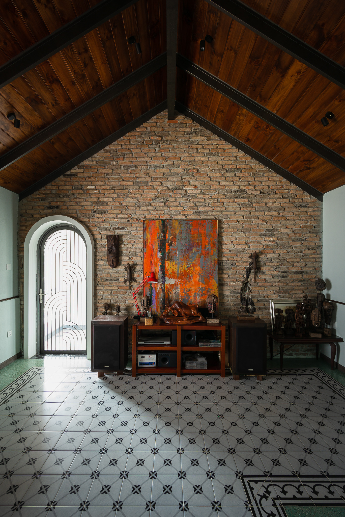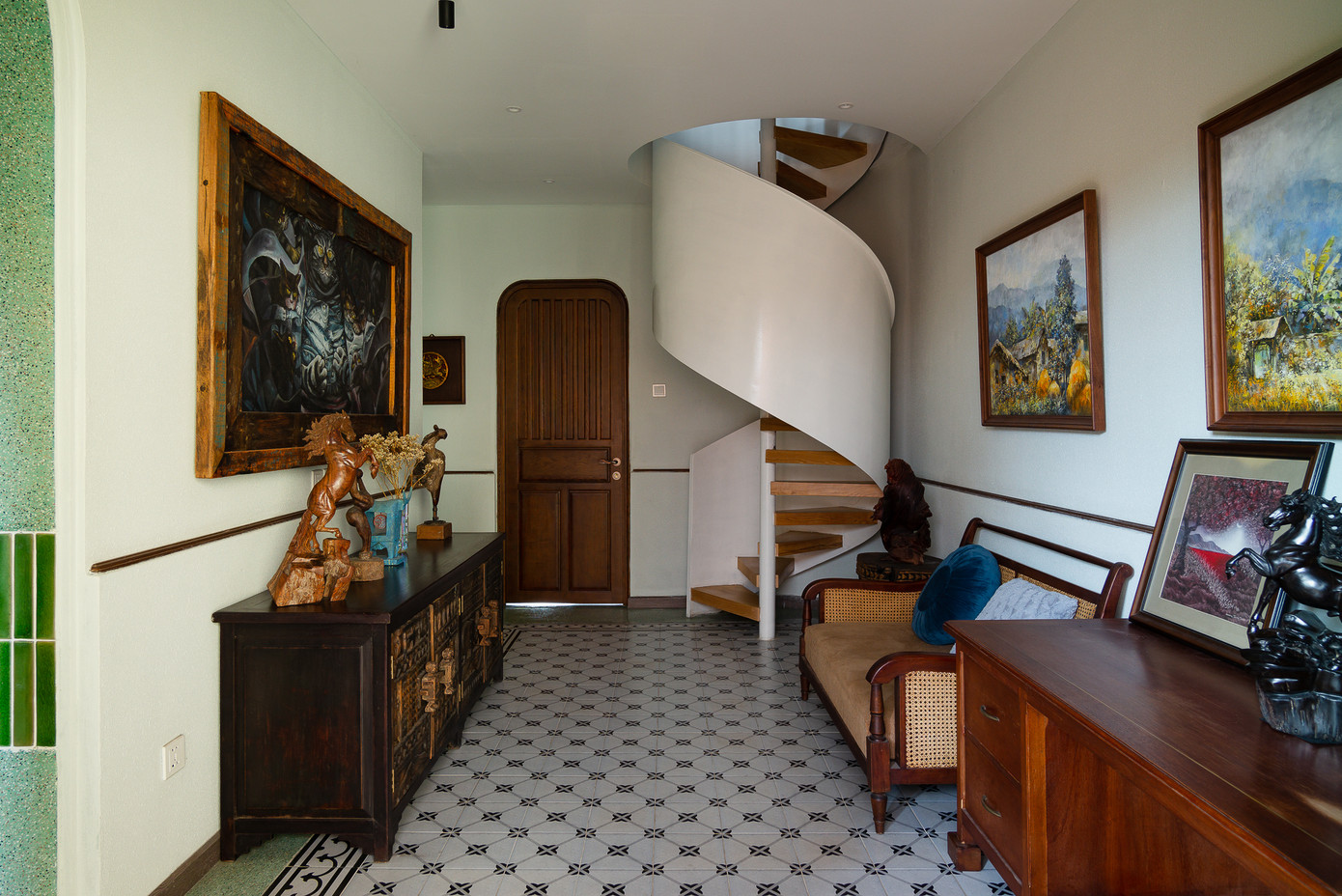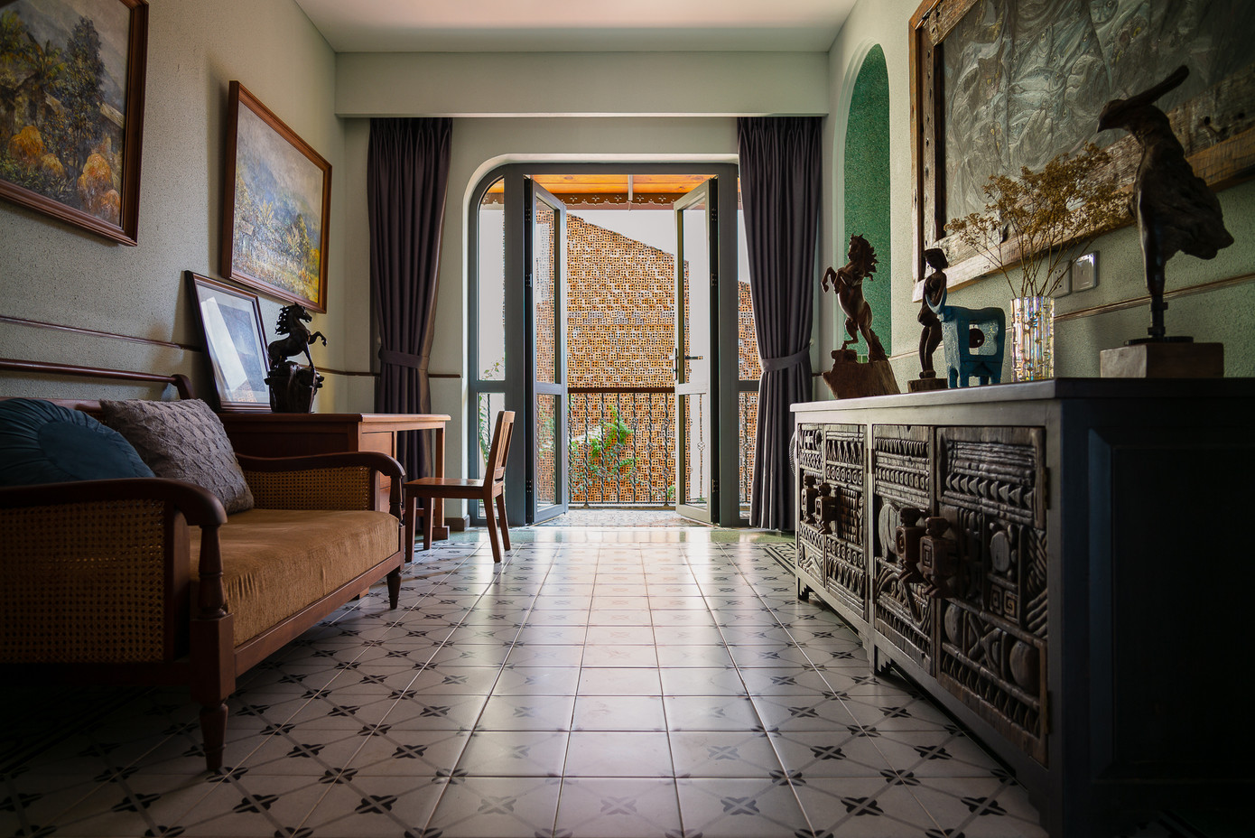 | Phòng khách mang đậm hơi thở Đông Dương với nội thất gỗ, tượng điêu khắc, gạch bông lót sàn, con tiện, tranh sơn dầu, đèn chụp kiểu Pháp.... |