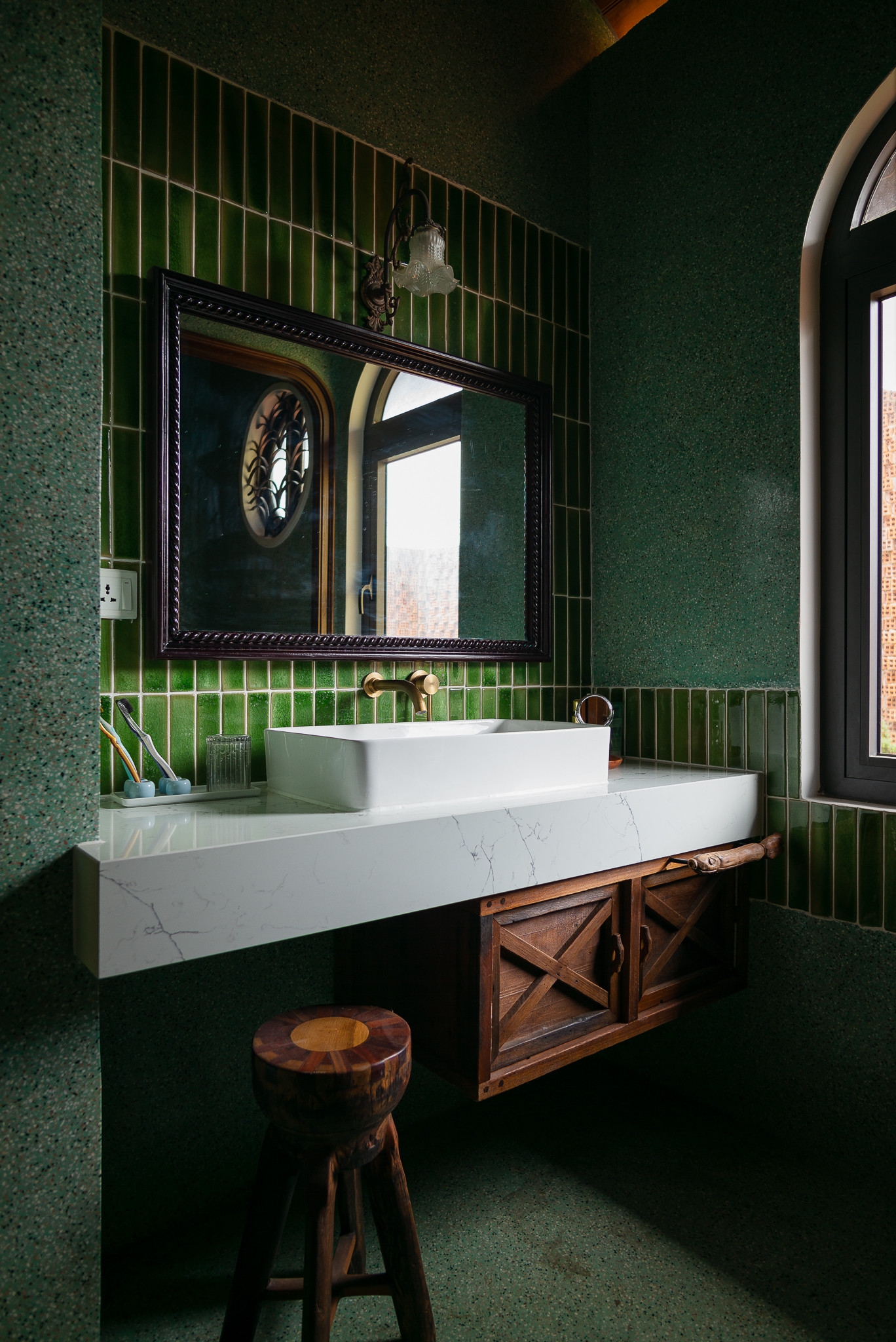 Để có sự kết nối hoàn thiện tổng thể căn nhà, không gian vệ sinh sử dụng gạch thẻ gốm rạn phối cùng đá xám tự nhiên, liên kết chặt chẽ với hoa văn gạch sàn và màu sơn tường xanh lá chủ đạo.