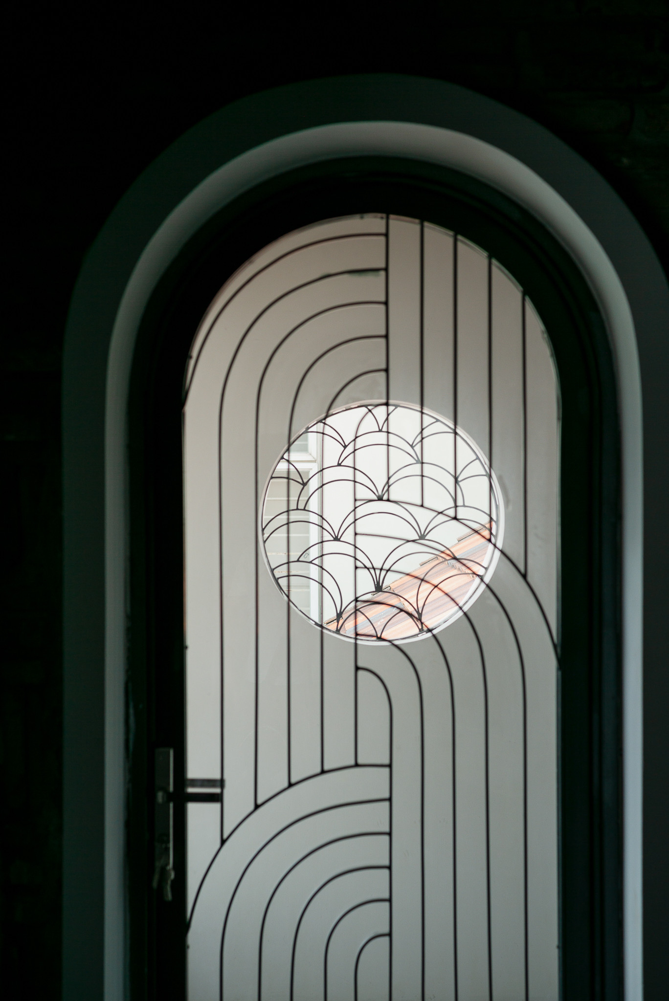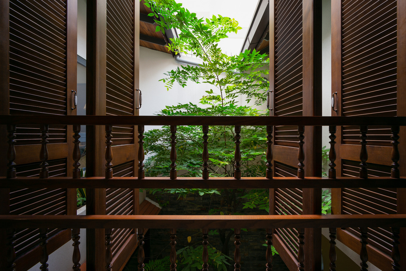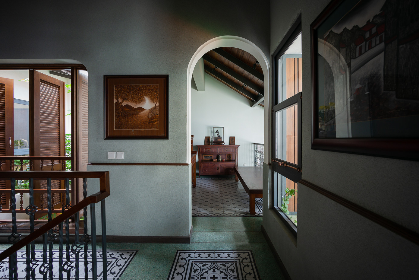 Hướng cầu thang lên lầu 1 là một hành lang ngập tràn ánh sáng được nhận từ khu vườn thông tầng xuống tầng trệt, kết hợp hệ cửa lam lấy gió đối lưu các không gian trong nhà.