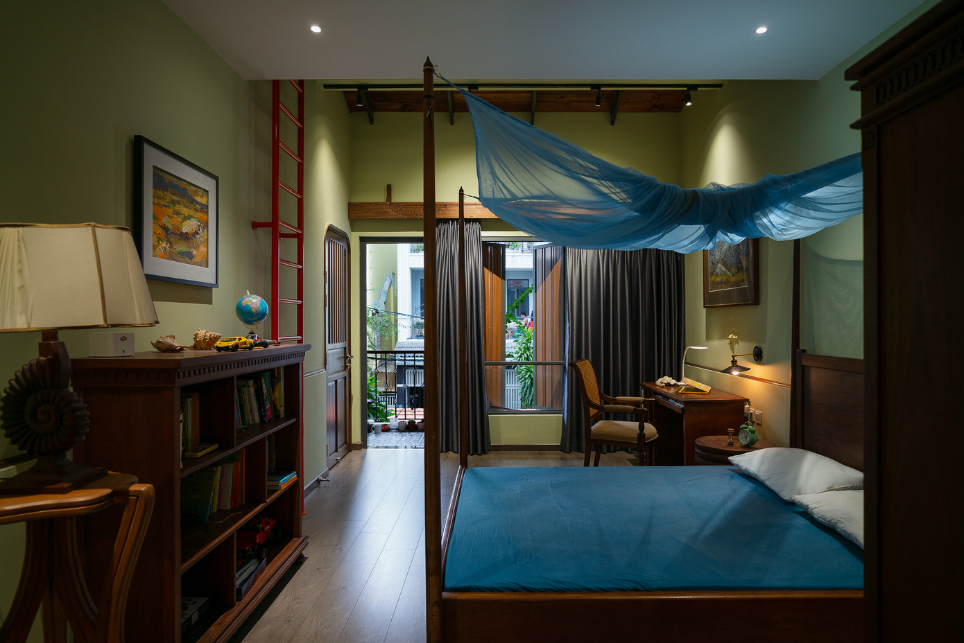 Tiếp đến là phòng ngủ của con được mở rộng không gian nhờ bố trí thêm phần gác xép phía bên trong phòng tạo sự riêng tư cho bé. Chiếc thang đỏ hướng lên gác xép như là điểm sáng mang lại chút năng động, tươi trẻ cho căn phòng giữa chút trầm của tổng thế căn nhà.
