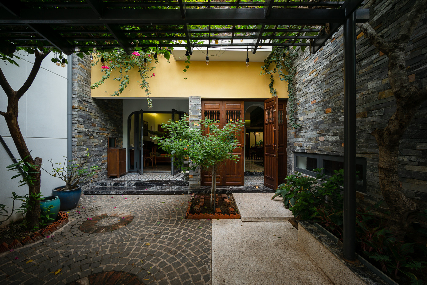 | Phần mặt tiền gợi nhớ về kiến trúc nhà truyền thống nhờ những chất liệu và hình ảnh quen thuộc như mái ngói, gỗ tự nhiên, gạch thẻ, họa tiết cách điệu trống đồng... |
