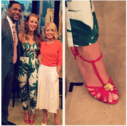 Sau đó, Blake có mặt tại show "Live with Kelly and Michael" với bộ juimpsuit họa tiets nhiệt đới và sandal cao gót hồng của Charlotte Olympia