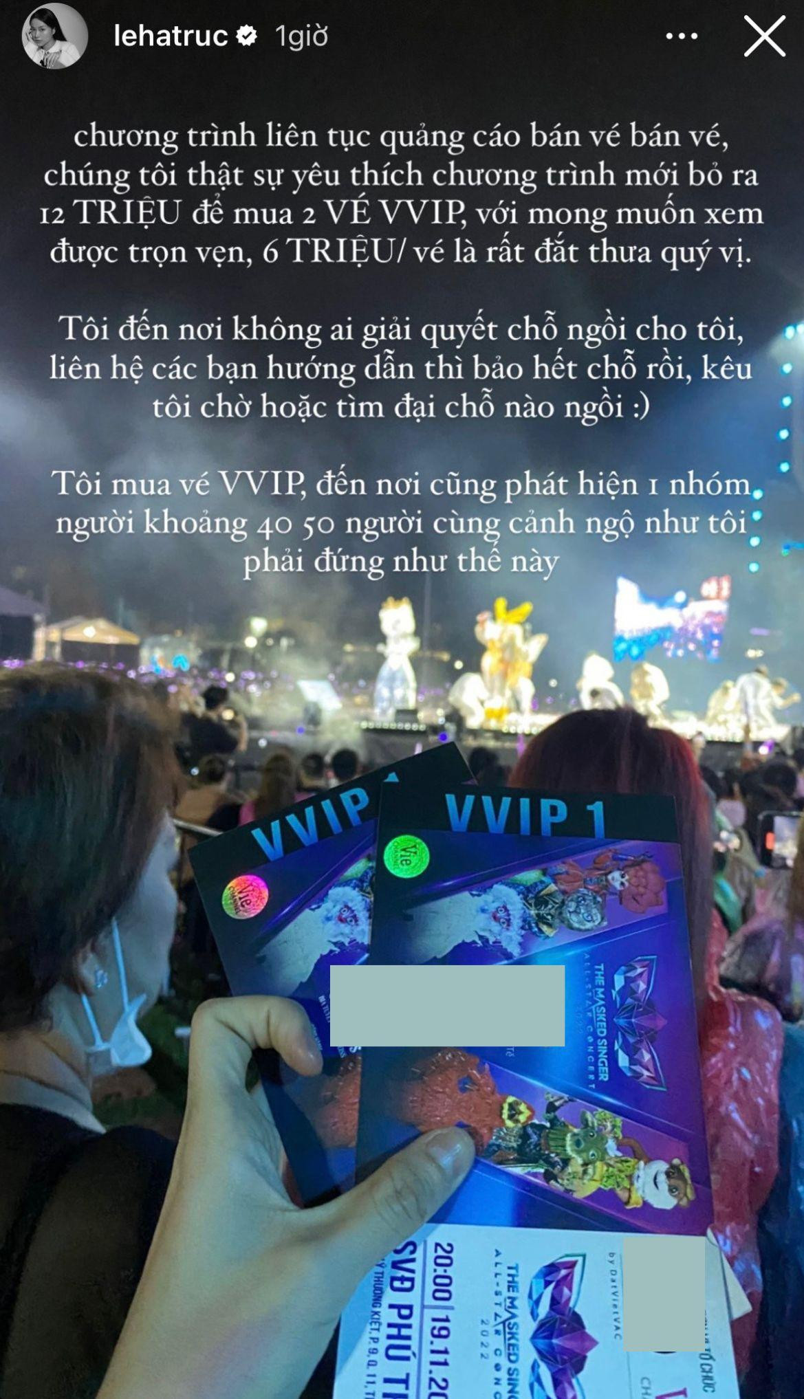 Tuy nhiên, ngay khi đêm concert bắt đầu diễn ra, blogger Lê Hà Trúc cùng bạn trai là cơ trưởng Quang Đạt đã có những chia sẻ bức xúc trên tài khoản mạng xã hội cá nhân về khâu tổ chức của Ca Sĩ Mặt Nạ. Cụ thể, người đẹp 9X khẳng định cô và bạn trai đã chi 12 triệu đồng để sở hữu cặp vé VVIP. Theo thông tin từ Ban tổ chức, khán giả sở hữu vé VVIP sẽ được bố trí khu vực ngồi riêng, sát sân khấu.