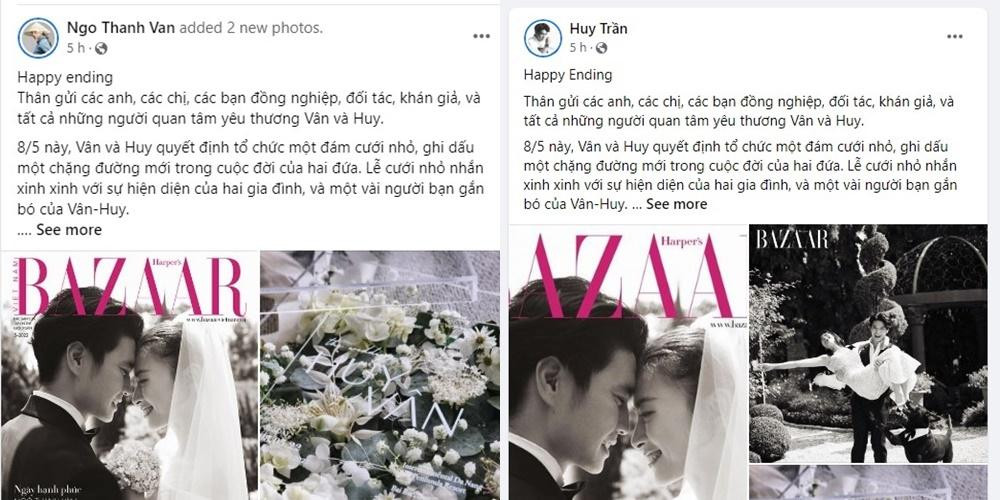 Chia sẻ về lễ cưới sắp tới, cả Ngô Thanh Vân và Huy Trần đều đồng loạt đăng status kèm theo một vài bức hình cưới: