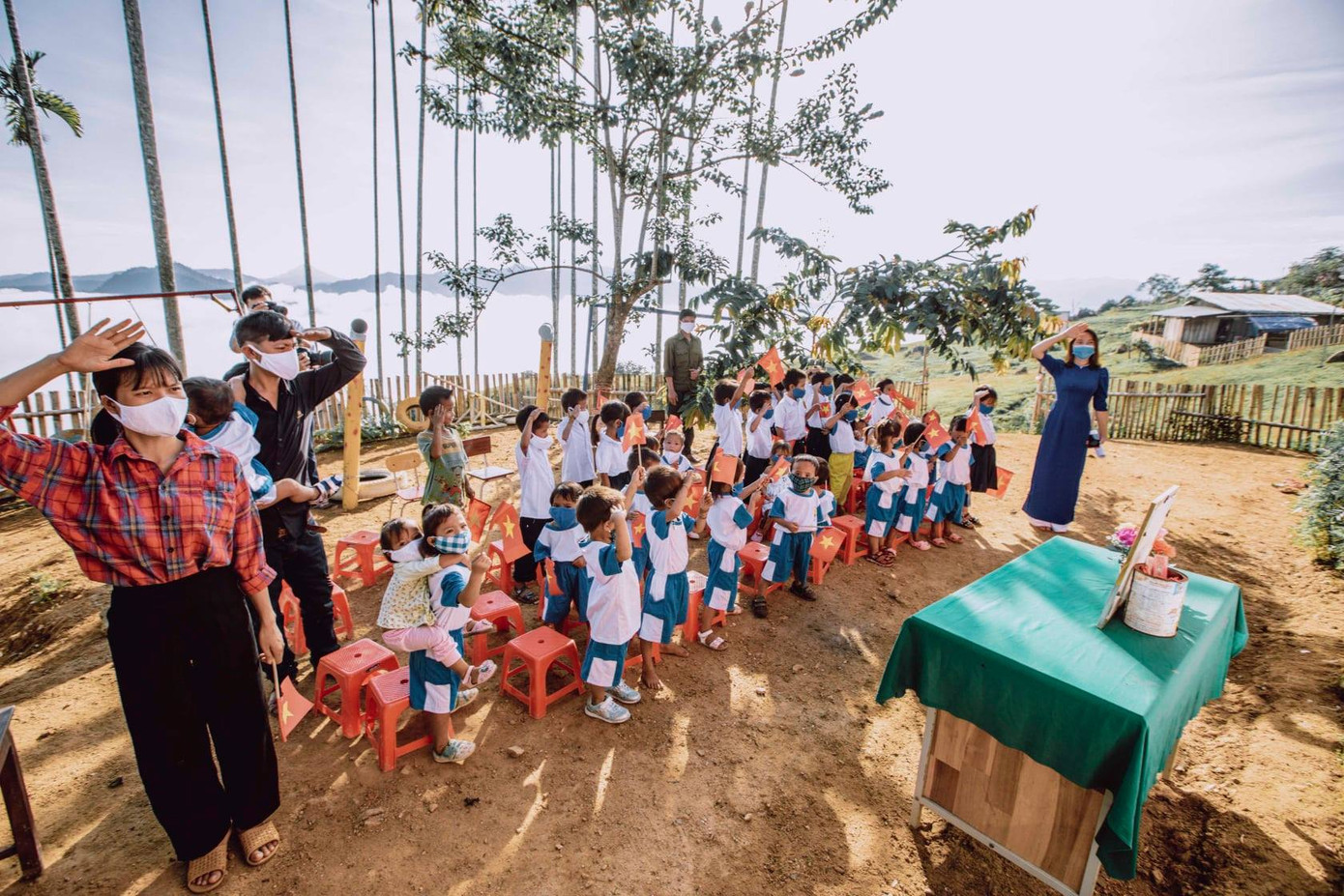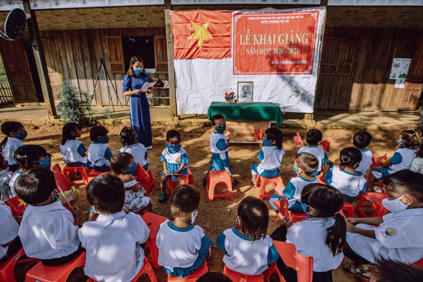 Bộ ảnh được anh Lê Quang Long (người thực hiện chương trình thiện nguyện “Mùa Đông cho em - Hành trình về với Tây Bắc") ghi lại trong ngày khai giảng năm học mới 2020 - 2021. Thời điểm ấy cả nước đang chung tay phòng chống đại dịch COVID-19 nên các em học sinh phải đeo khẩu trang đến trường.