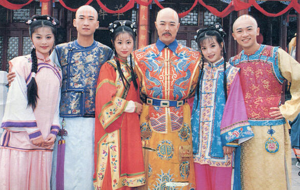 Phạm Băng Băng (ngoài cùng bên trái) cùng Lâm Tâm Như (thứ ba từ trái sang) và Tô Hữu Bằng (ngoài cùng bên phải) chụp hình cùng Triệu Vy, Châu Kiệt và Trương Thiết Lâm trong thời gian tham gia bộ phim "Hoàn châu cách cách".
