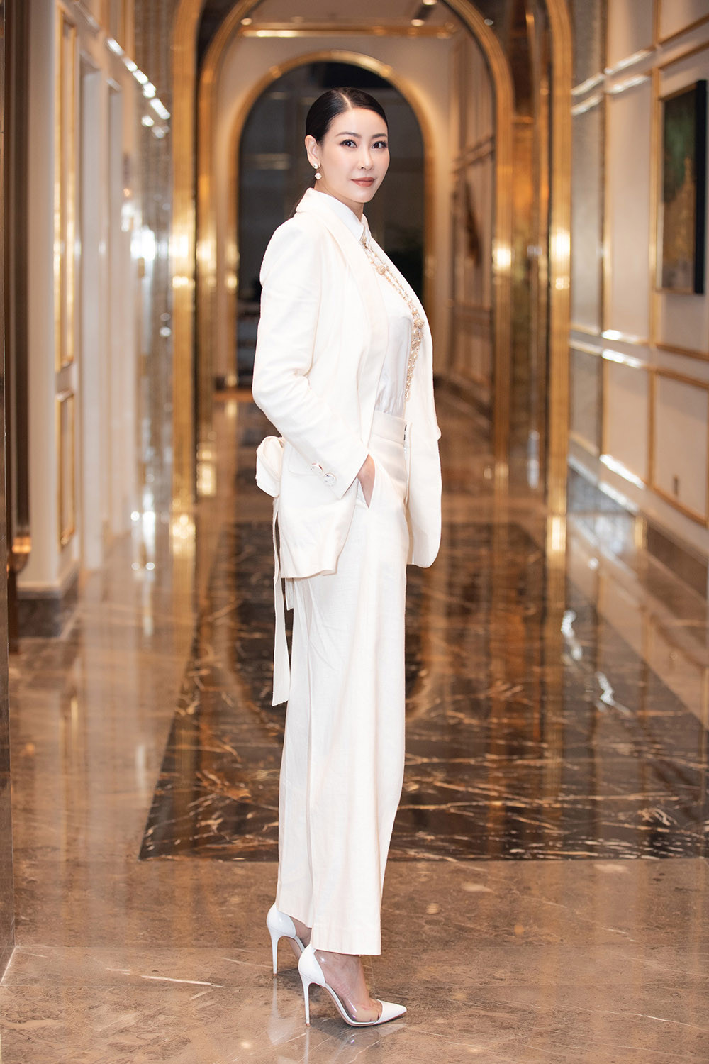 Hoa hậu Hà Kiều Anh diện suit màu trắng dáng oversize thanh lịch.