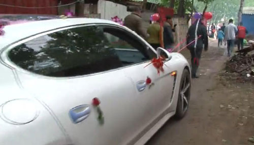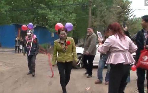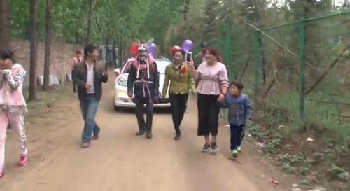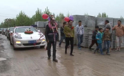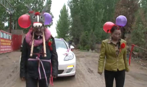 Hình ảnh một đám cưới kỳ lạ ở tỉnh Hà Nam, Trung Quốc đang làm xôn xao cộng đồng mạng nước này. Theo Chinanews, bố chú rể hóa trang thành lừa, mặc quần áo xấu xí, đầu buộc bóng bay, lưng buộc dây kéo theo chiếc xe hạng sang Porche đằng sau. Người mẹ đầu buộc thành từng túm tóc, đi ngay bên cạnh, cầm roi như thị uy.