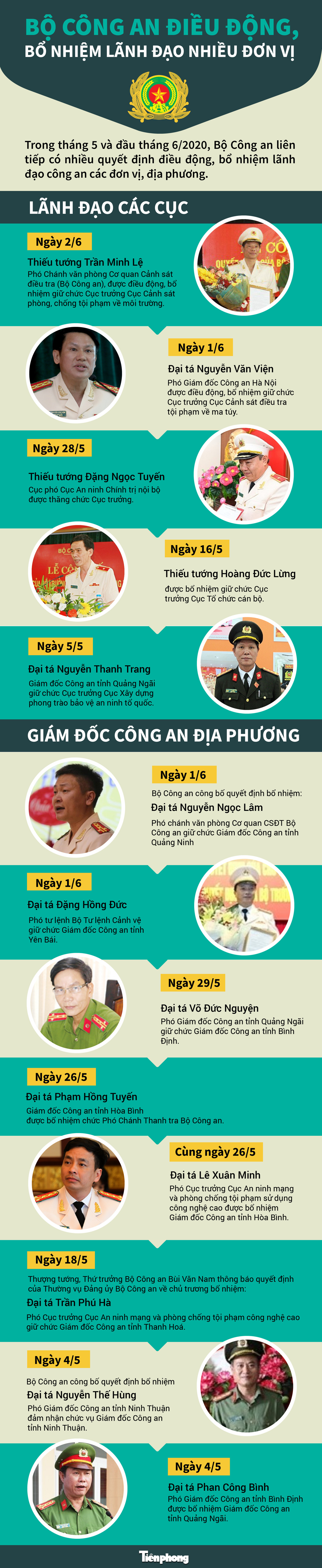 TPO - Trong tháng 5 và đầu tháng 6/2020, Bộ Công an liên tiếp có nhiều quyết định điều động, bổ nhiệm lãnh đạo công an các đơn vị, địa phương.