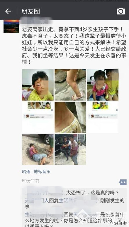 Sau khi Liu phát hiện ra thông tin đặt phòng khách sạn của vợ cũ hồi tháng 6, một tháng sau khi họ ly dị, Liu lúc nào cũng trong tình trạng say khướt, bắt đầu đánh đập dã man hai con. Người cha vô nhân tính còn chụp lại ảnh và đăng tải trên mạng xã hội. Vụ việc ngay lập tức thu hút sự chú ý của cộng đồng mạng.