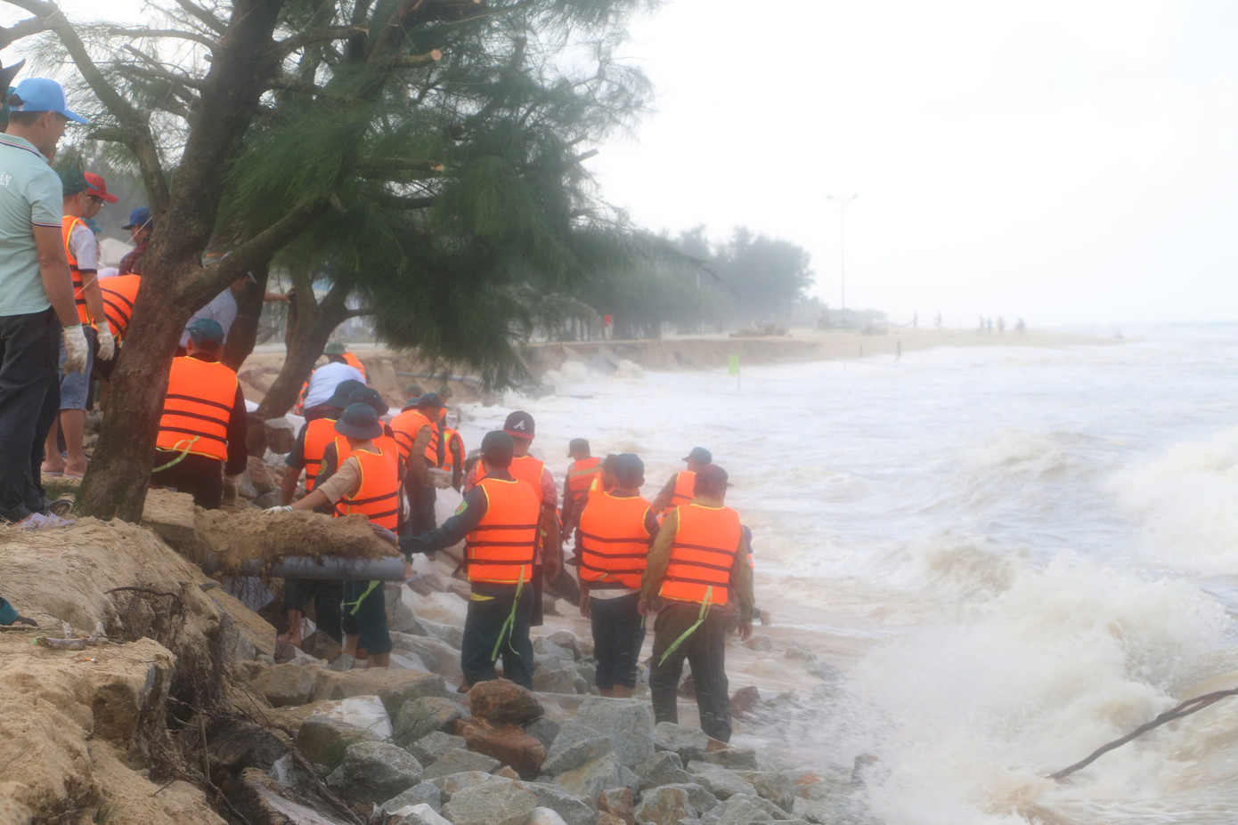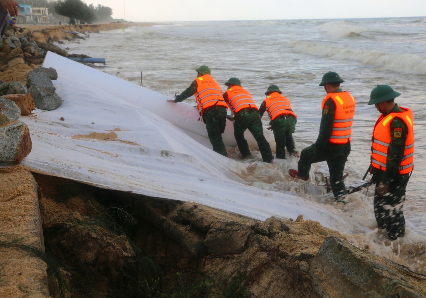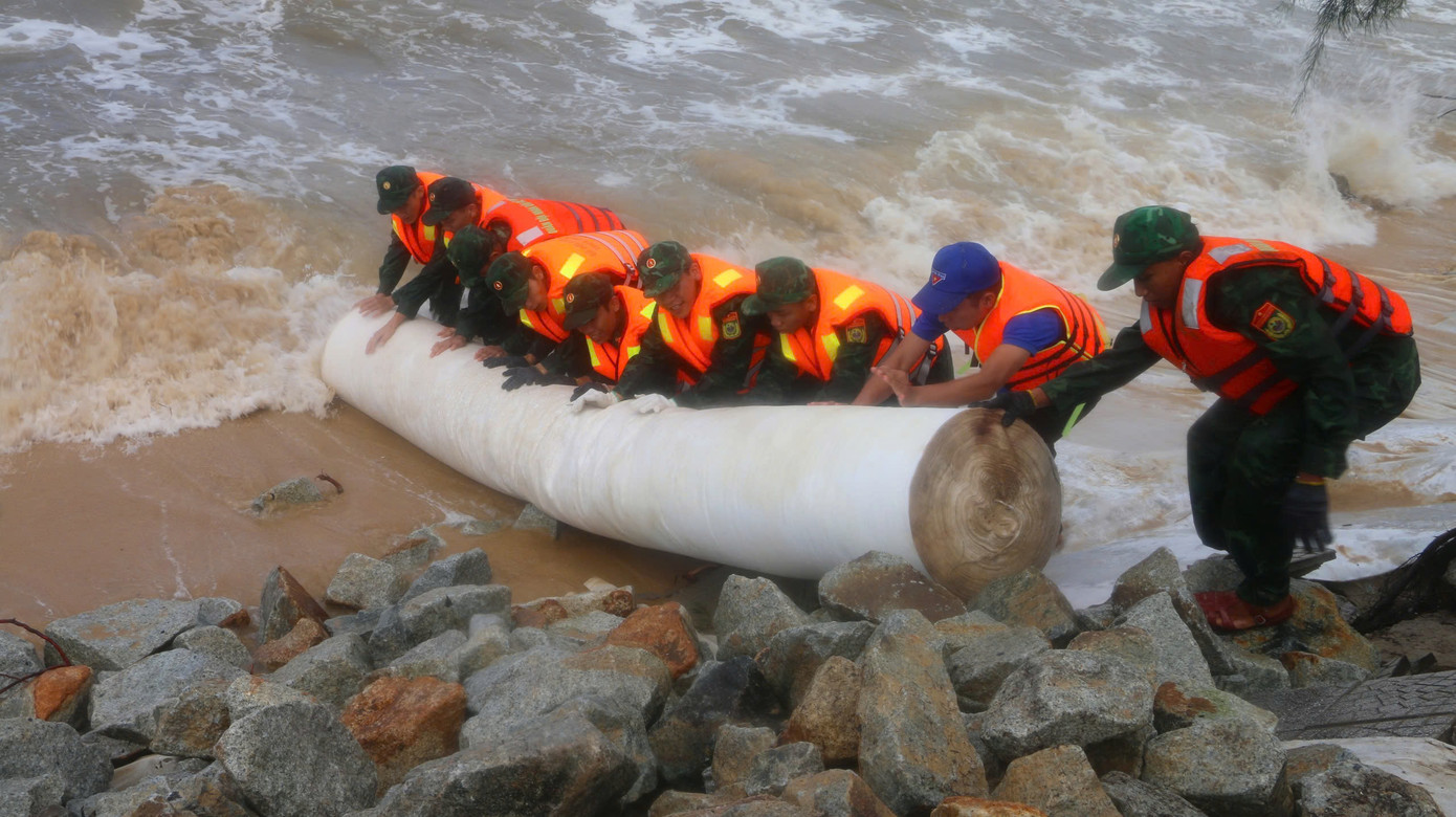 | Khắc phục tạm thời tình trạng sạt lở bờ biển trước bão số 6. |