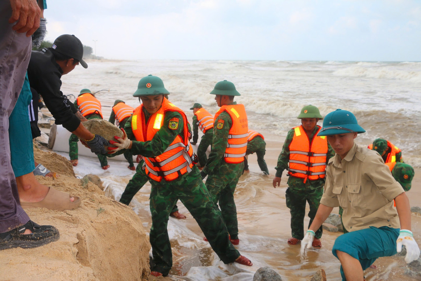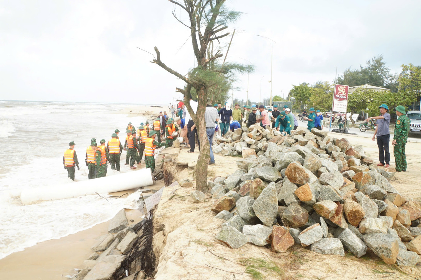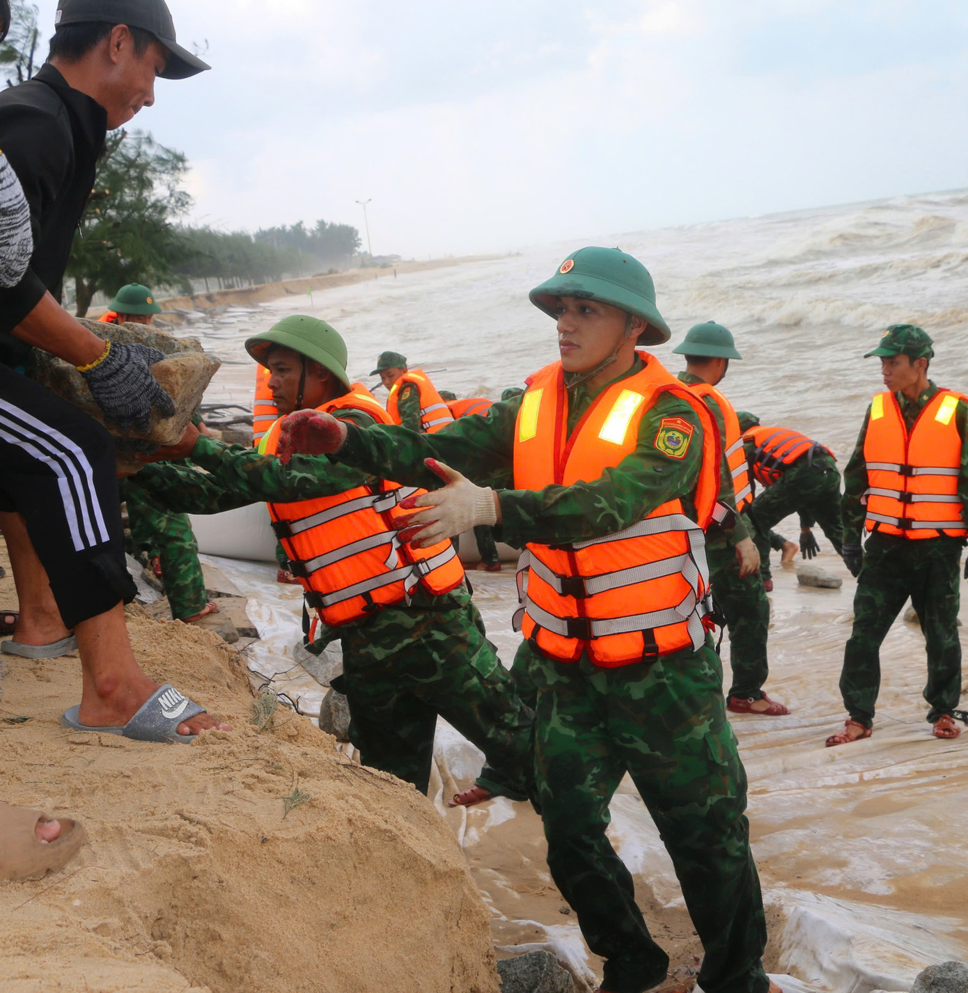 | Khắc phục tạm thời tình trạng sạt lở bờ biển trước bão số 6. |