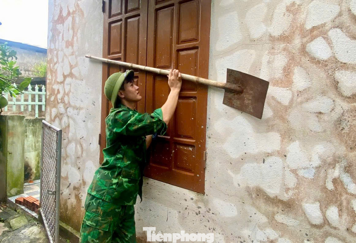 | Cán bộ, chiến sỹ BĐBP đồn Cửa Lân hỗ trợ chằng, chống nhà cửa cho hộ bà Nguyễn Thị Thắm, thôn Hoàng Môn, xã Nam Cường, 70 tuổi, neo đơn. |