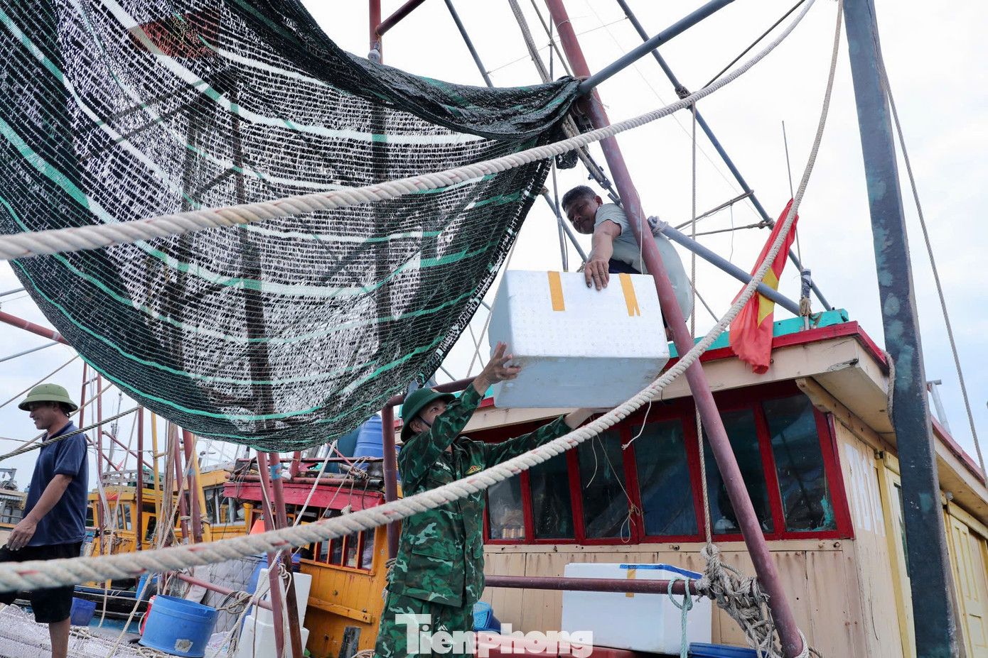 | Chiến sỹ BĐBP đồn Cửa Lân giúp ngư dân chằng buộc phương tiện phòng chống bão số 3. |