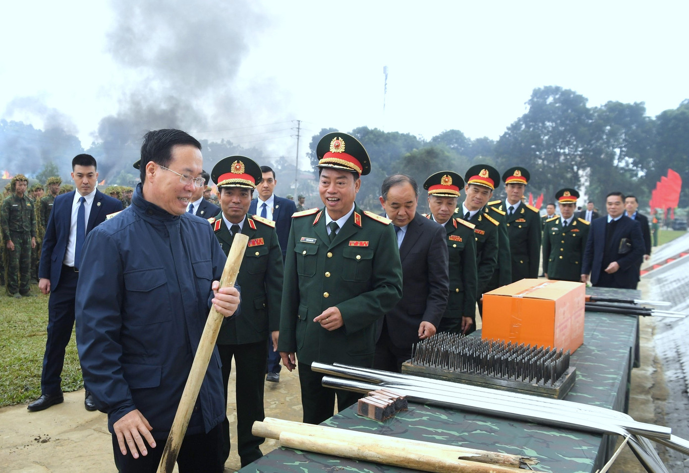 | Chủ tịch nước tham quan một số loại vũ khí, trang bị phục vụ quá trình huấn luyện, sẵn sàng chiến đấu của bộ đội đặc công. |