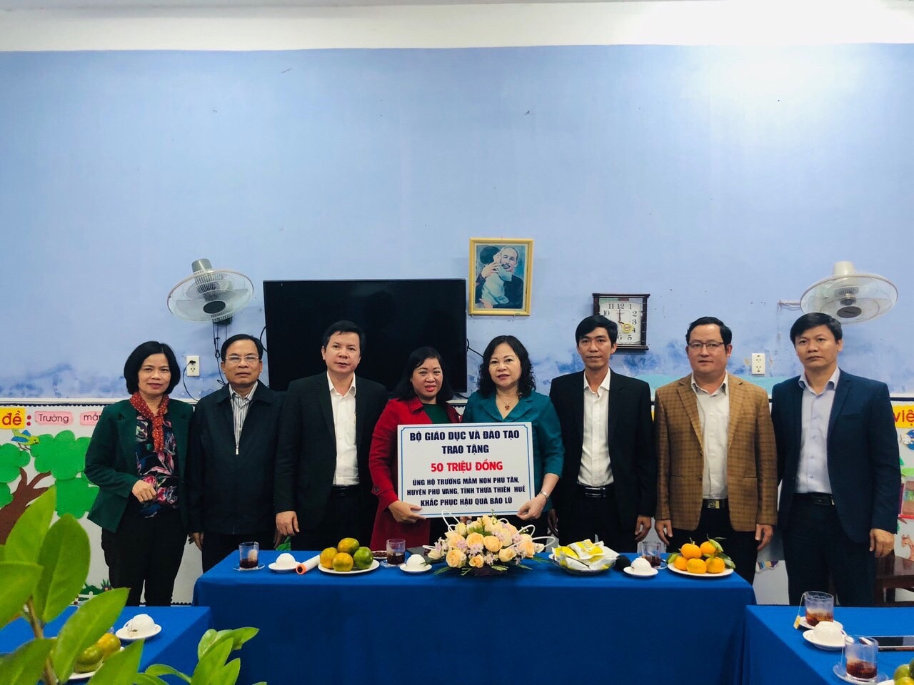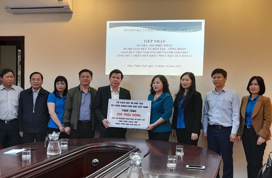 Dịp này, thứ trưởng Ngô Thị Minh, thay mặt cho Bộ GDĐT, công đoàn giáo dục Việt Nam trao tặng 200 triệu đồng cho ngành giáo dục Thừa Thiên Huế và 100 triệu đồng cho công đoàn đại học Huế để góp phần khắc phục bão lũ.