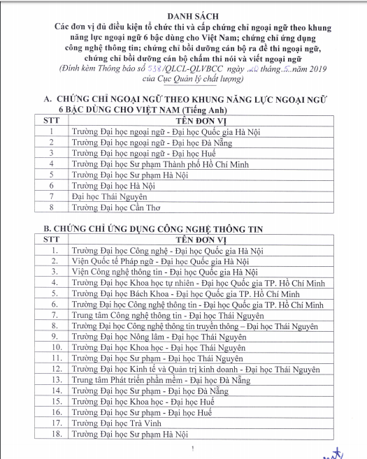 Theo đó, với chứng chỉ ngoại ngữ theo khung năng lực ngoại ngữ 6 bậc dùng cho Việt Nam chỉ có 8 đơn vị đủ điều kiện tổ chức thi và cấp chứng chỉ, chủ yếu là các trường đại học.