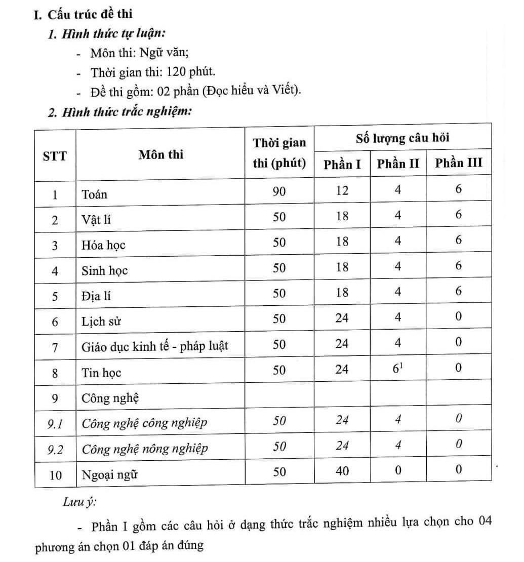 Theo đó, từ năm 2025, môn Ngữ văn thi theo hình thức tự luận, thời gian làm bài thi là 120 phút. Đề thi gồm 2 phần: đọc hiểu 4 điểm và viết chiếm 6 điểm.