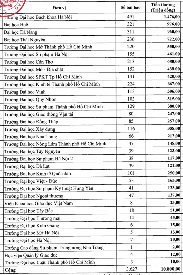 Theo danh sách khen thưởng, Trường ĐH Bách khoa Hà Nội tiếp tục dẫn đầu khi có số lượng bài báo khoa học nhiều nhất trong số các trường được khen thưởng. Cụ thể, trường này công bố 491 bài, tổng tiền thưởng gần 1,5 tỉ đồng.